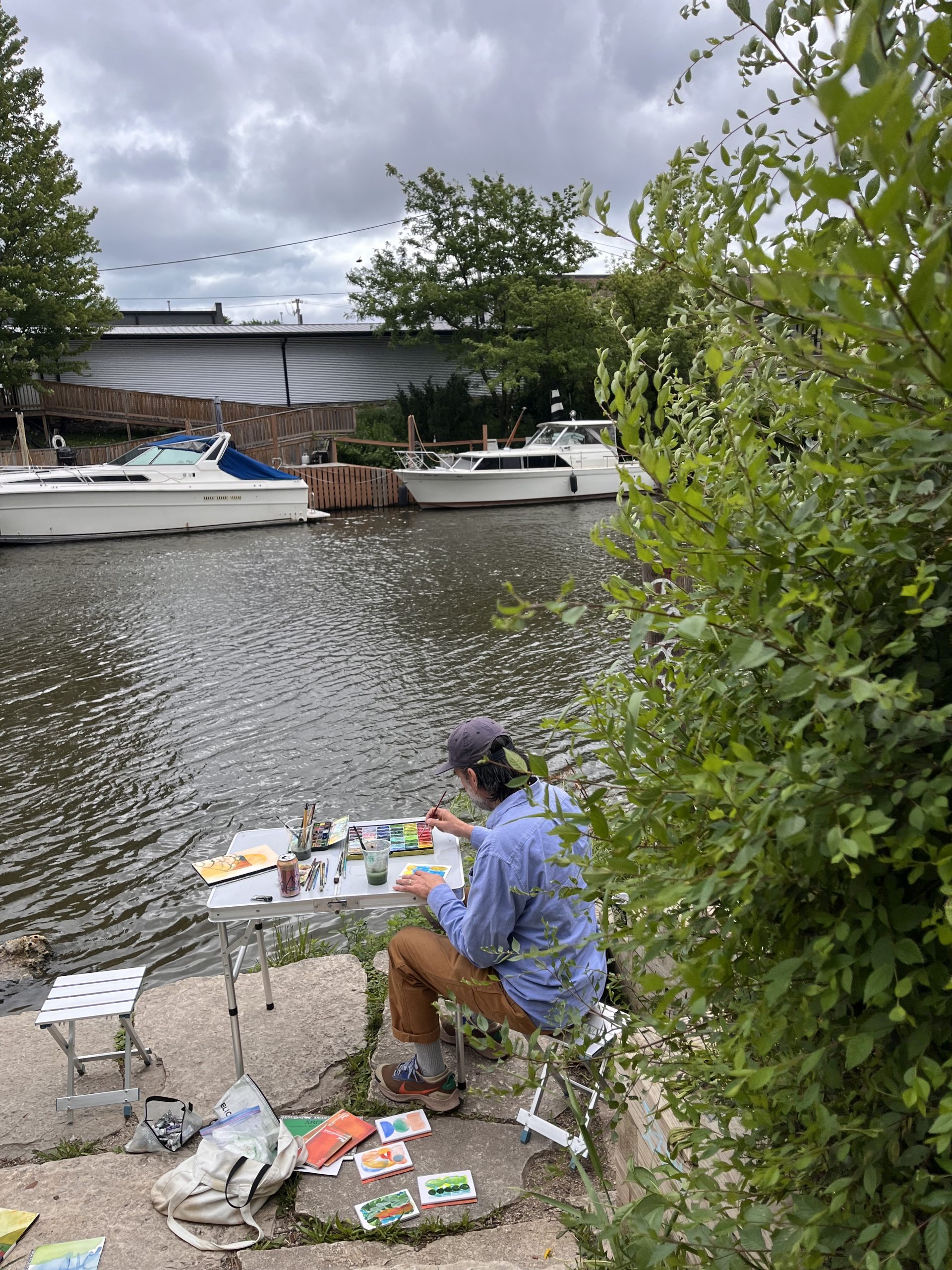 I had a great morning painting along the north branch of the Chicago River. My usual studio work is very thought out ahead of time with multiple studies worked out before making a finished piece so the idea of just sitting along the river with Leslie and making small paintings based on what I was seeing and feeling at that moment was a newer experience for me. It was thrilling but also daunting as it took me some time to not worry about the end result and just experiment on paper. Using watercolors is very new to me as well so that added to it. Was great to catch up with Leslie for a few hours. We have known each other for years but had not ever really sat down just the two of us and talked for a few hours. All in all it was a great day to be out there painting and talking about painting.