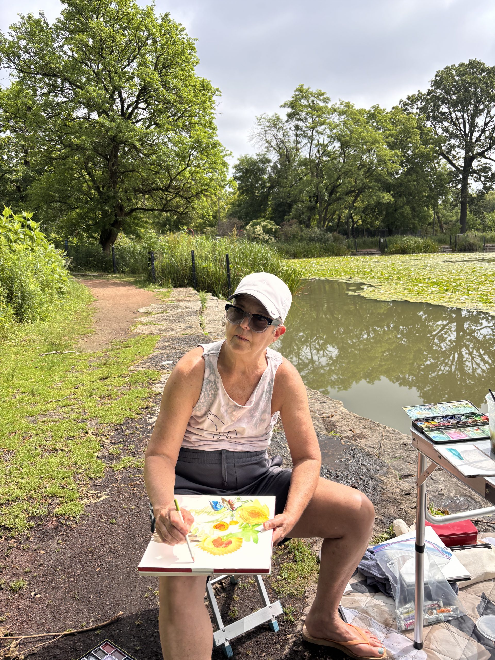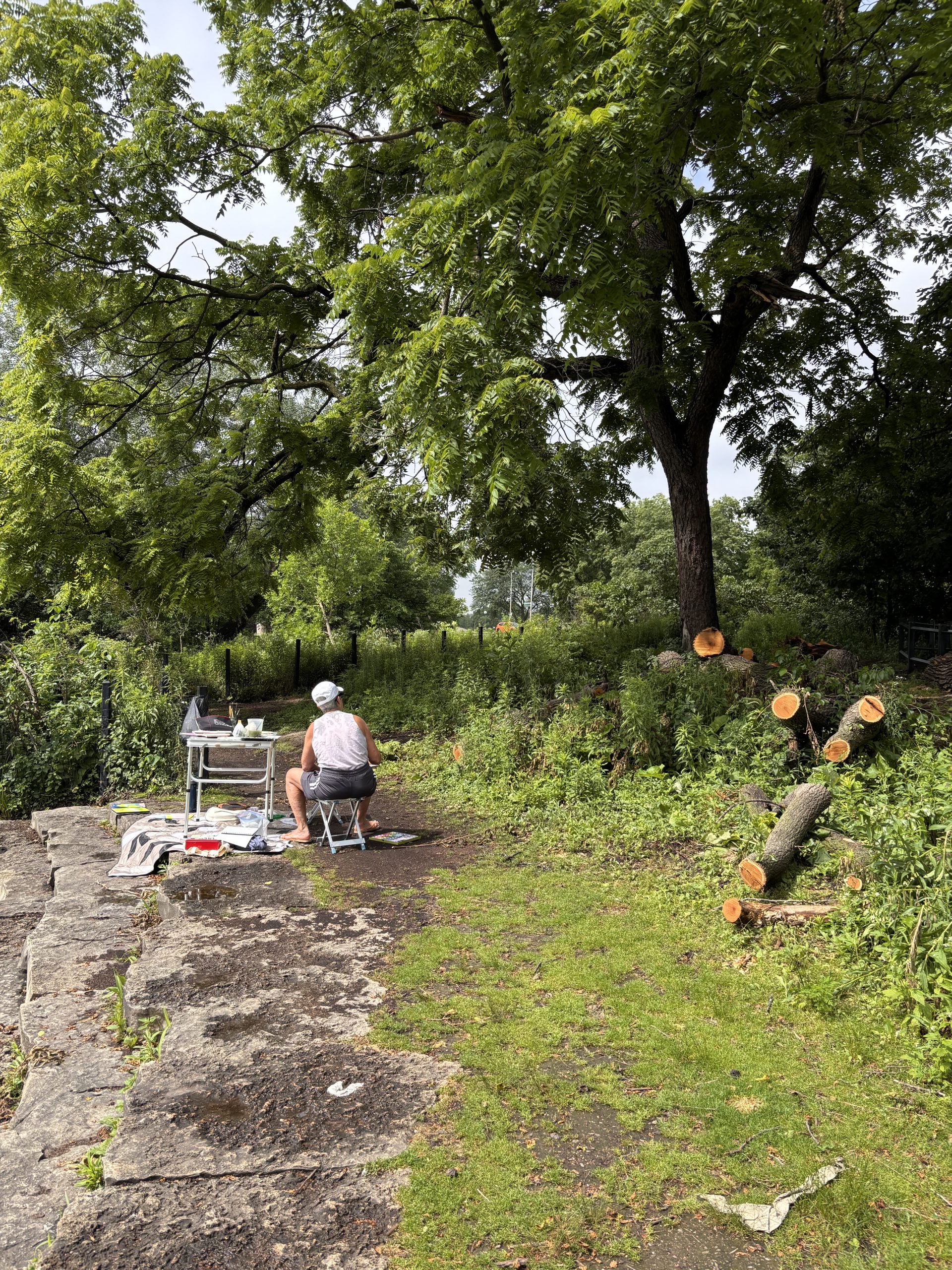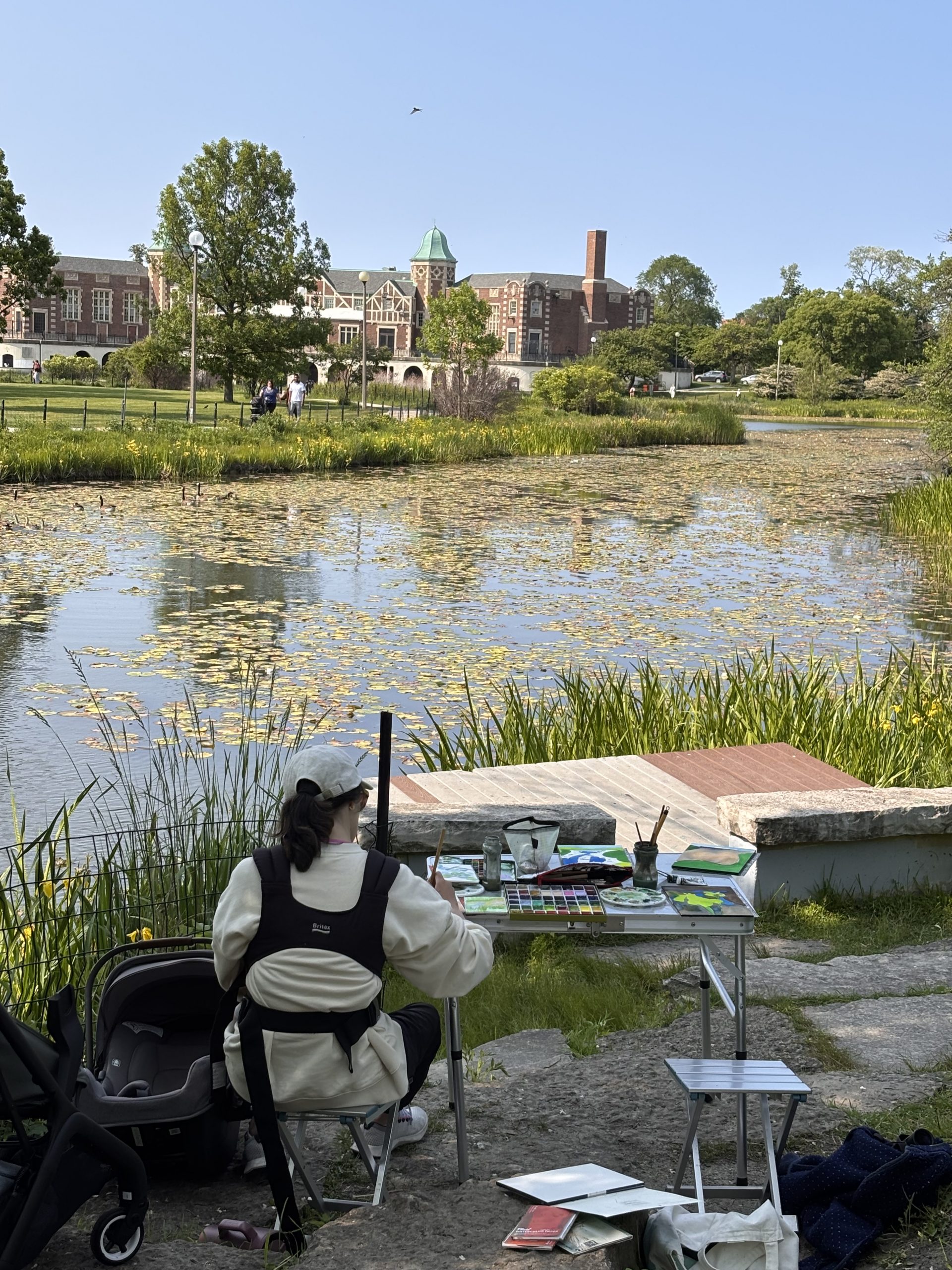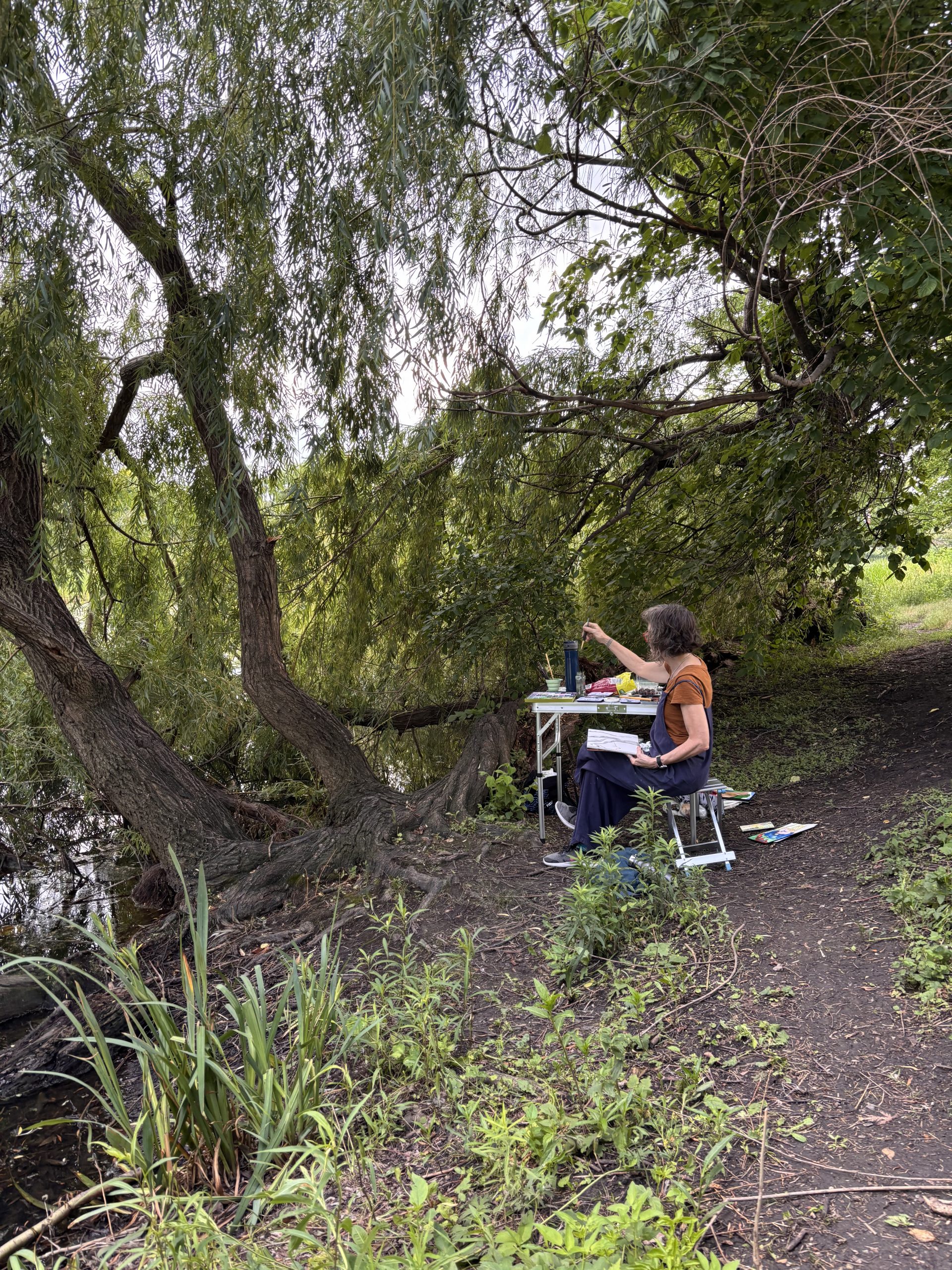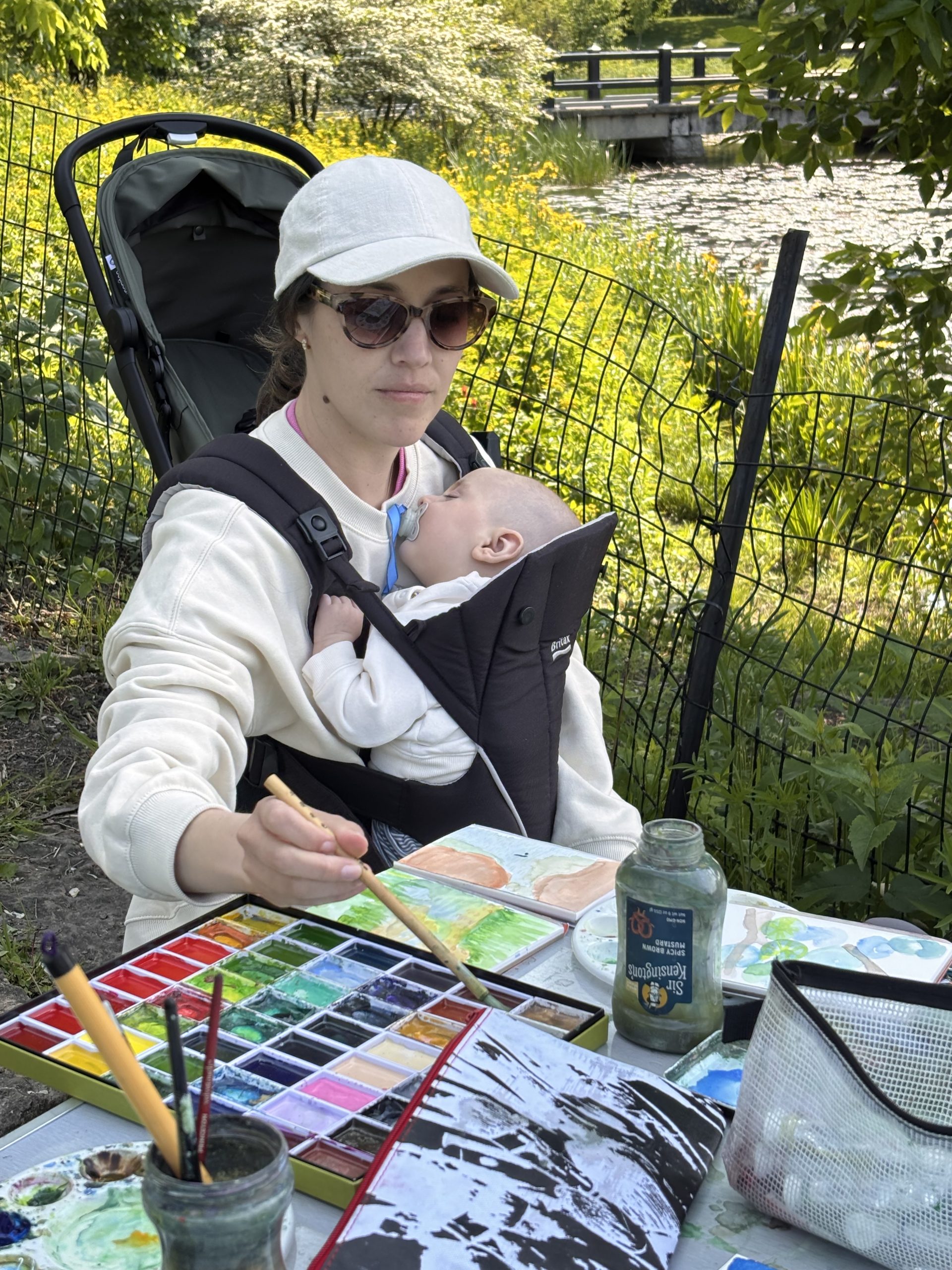 Painting outside was the break I needed to take. With the chaos it implies adapting to a new family member, sometimes we forget to make time to do what we love and what brings us joy. This painting session was a way of forcing myself to pause, observe, create and enjoy. Even while I was painting with my 3yo in arms, I was able to disconnect from parenting mode (at least for a couple of minutes) and connect with nature and art. Thank you, Leslie for this lovely time and for reminding me that I can make time to create and paint even with my kids. 🌸