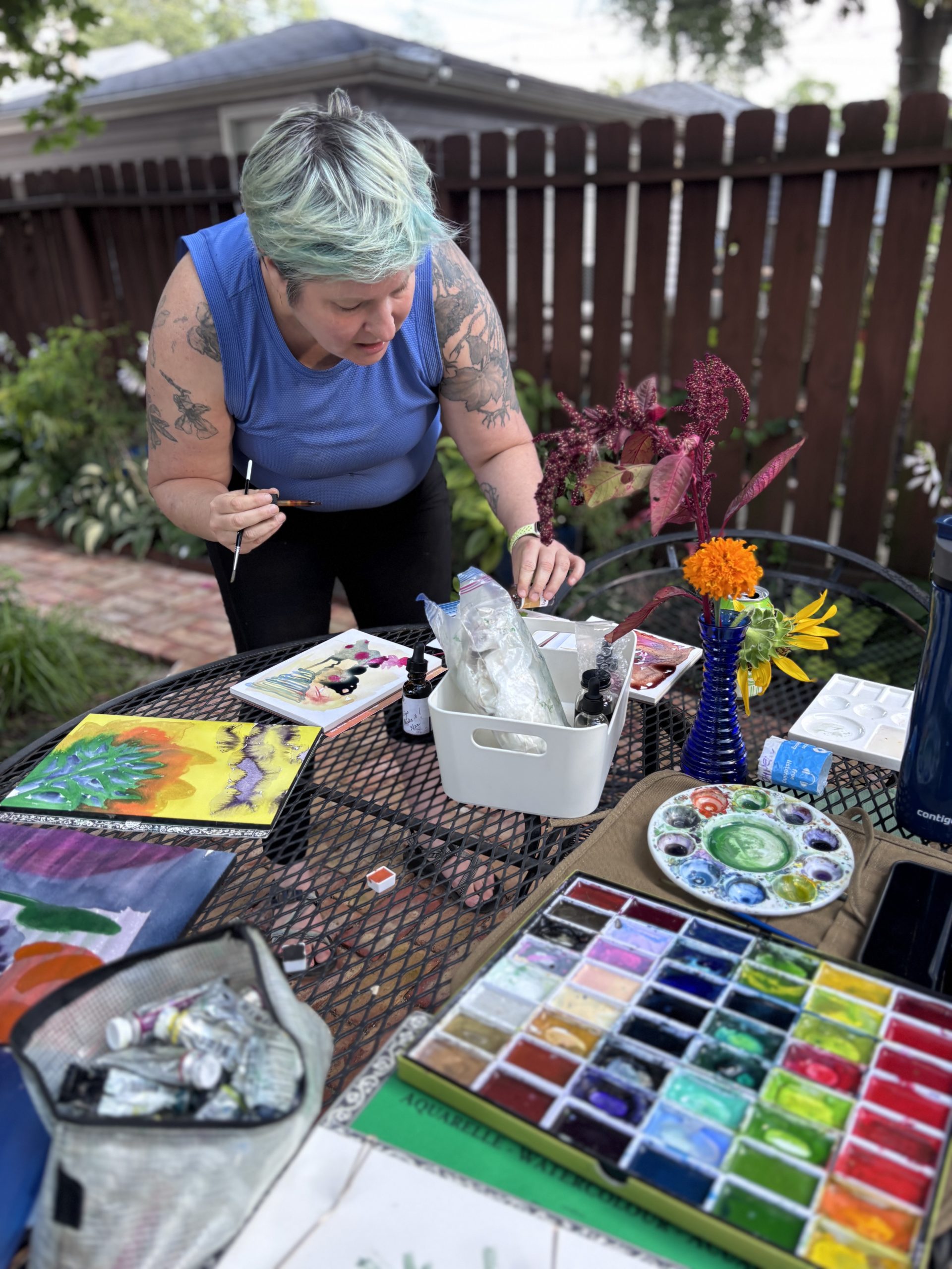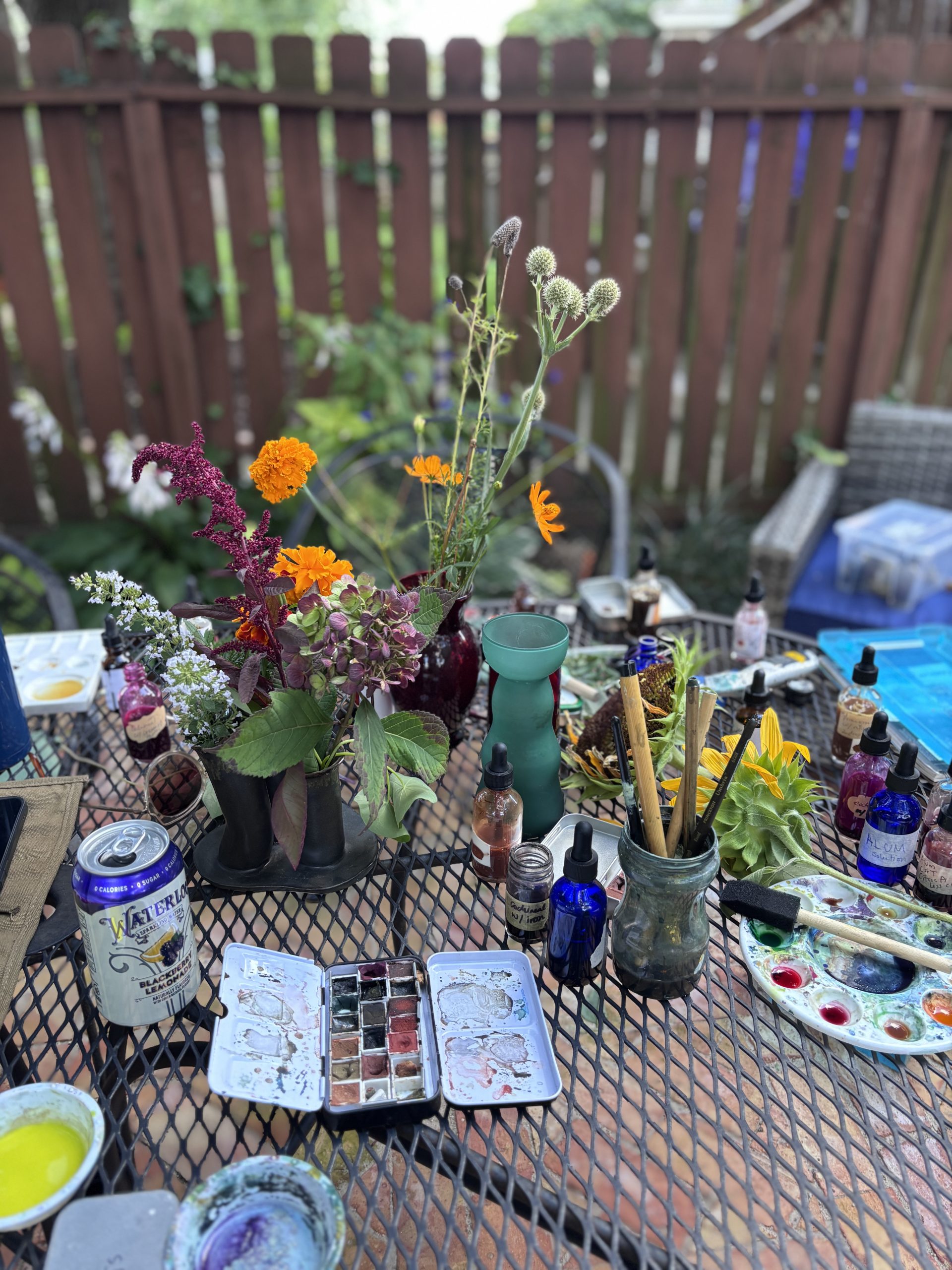 Warm afternoon light turning to chill fall twilight with tea. Joy in sharing colors, materials and flowers. Most of all so wonderful to share conversation while making.