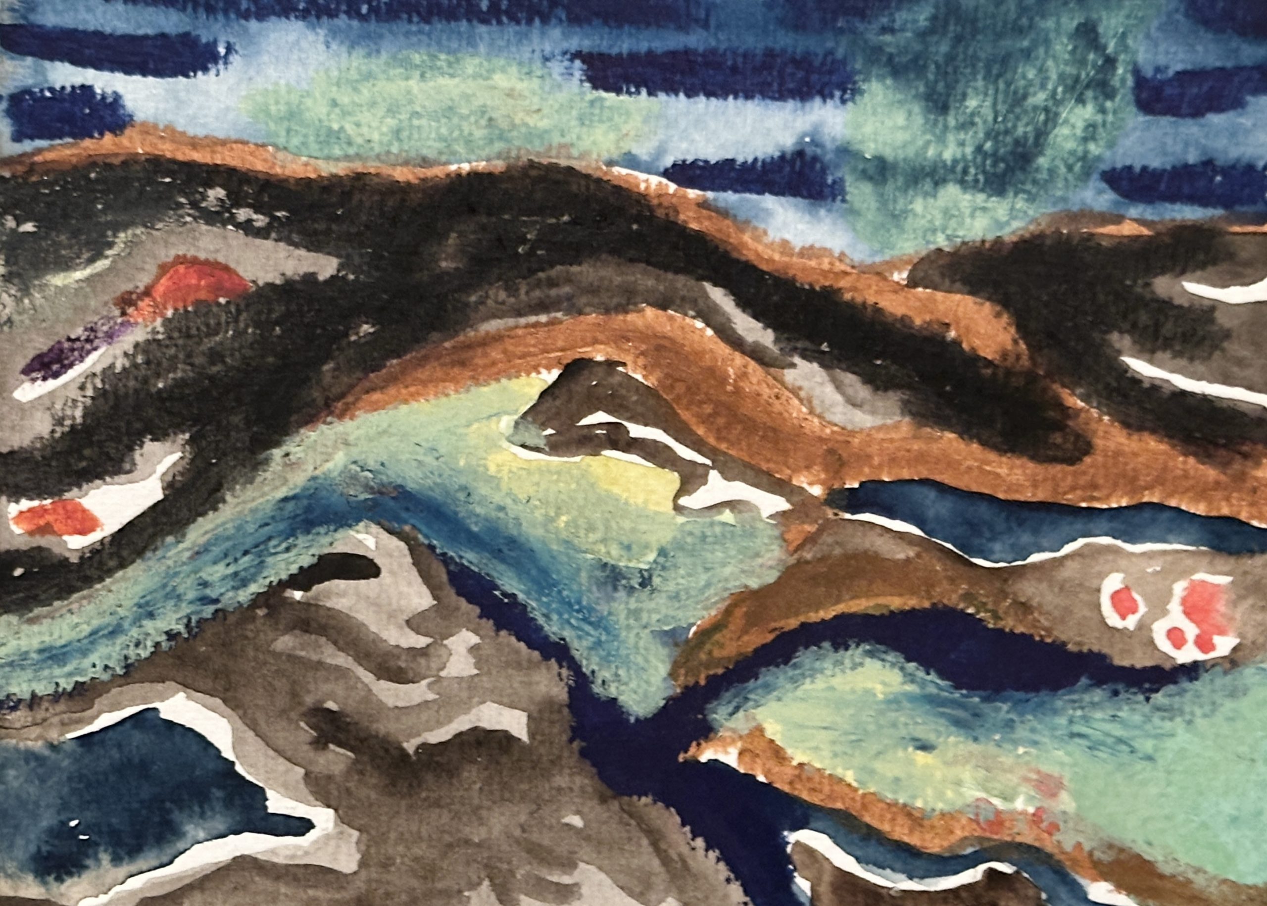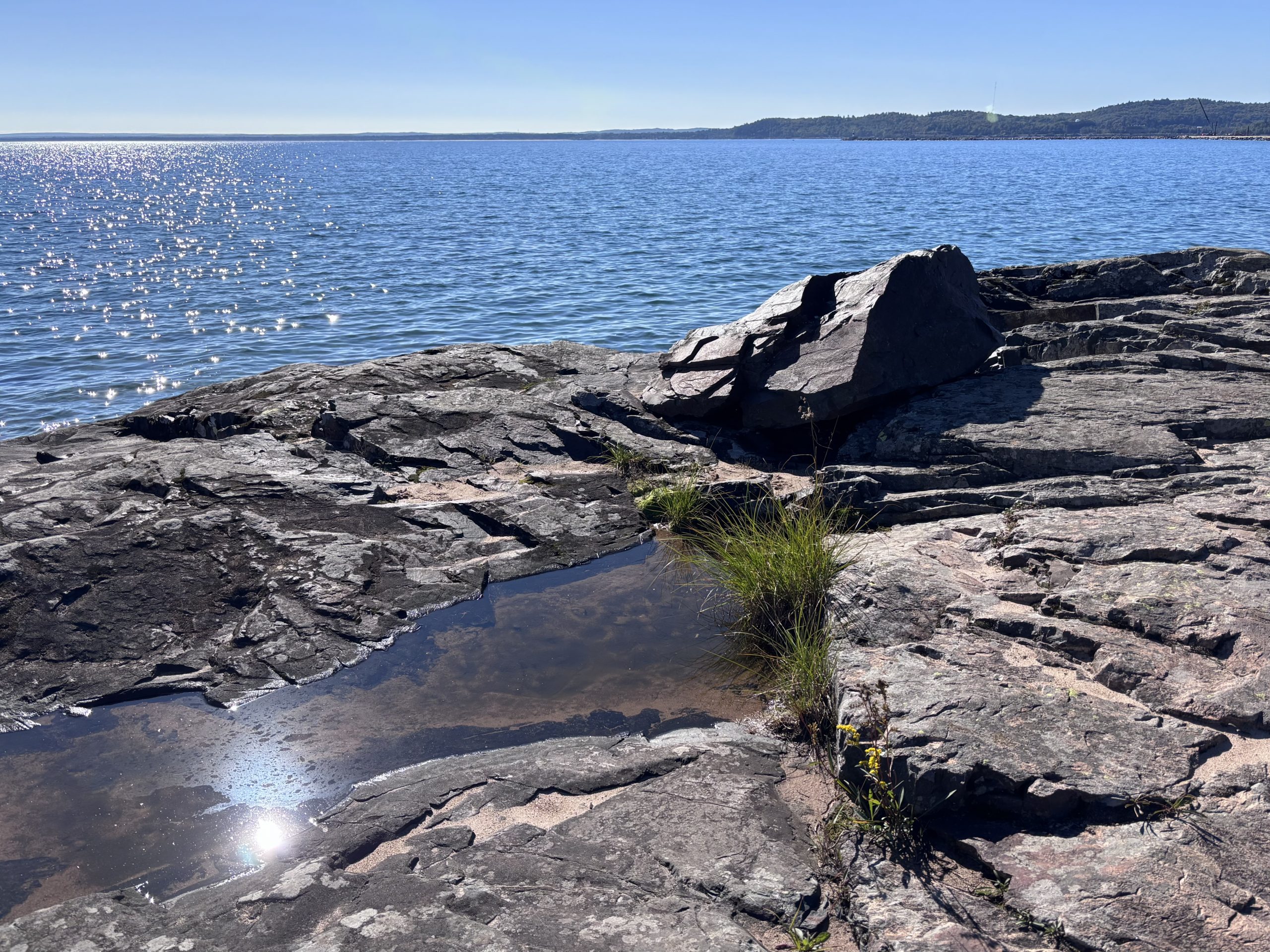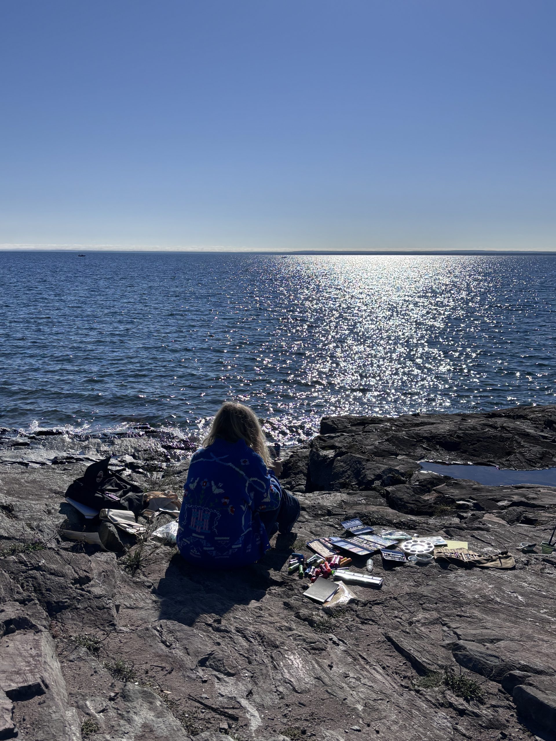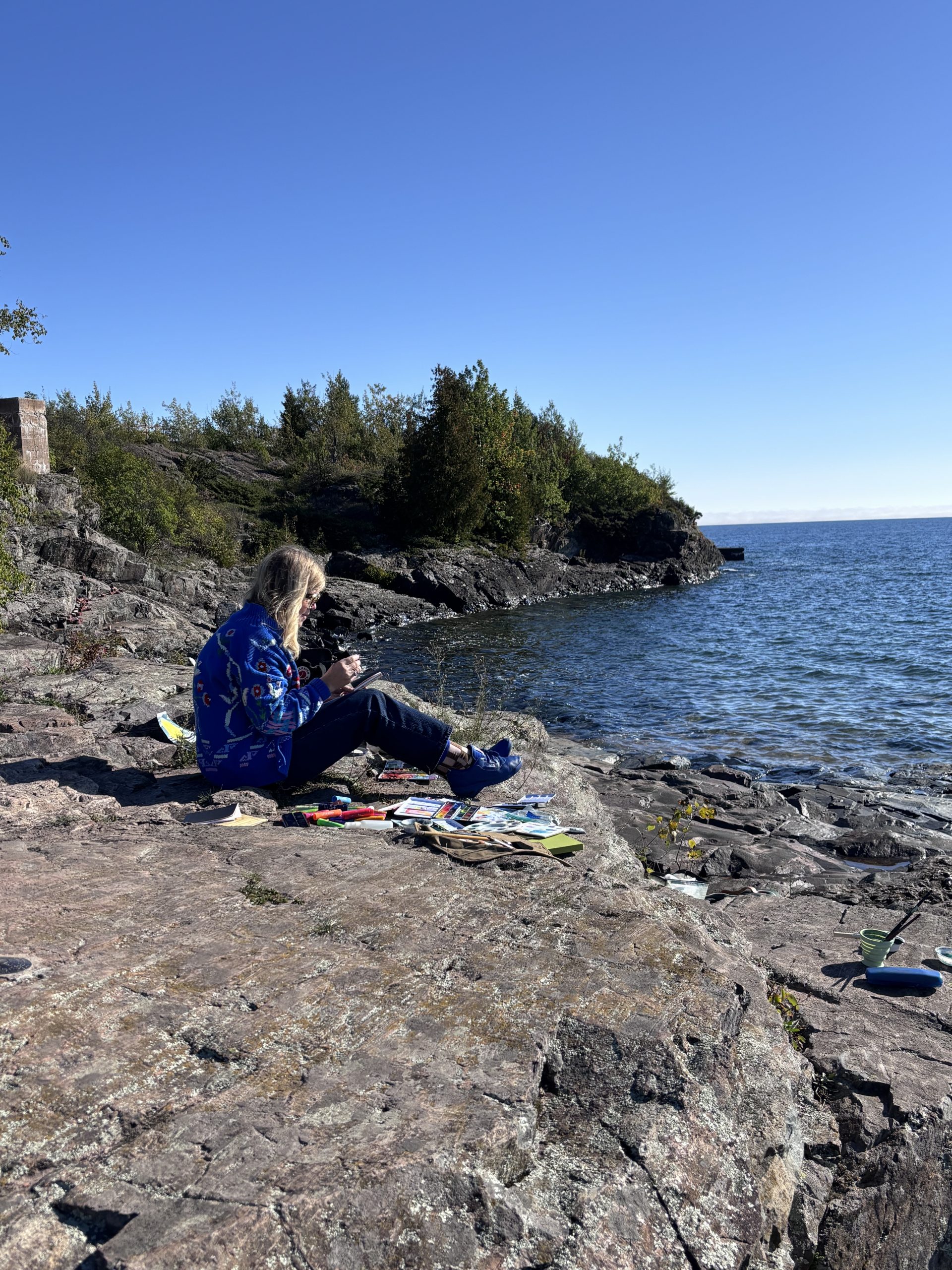 It was wonderful to paint with Leslie on the rocky Lake Superior shore on an unusually warm fall day. We watched the glittery light shimmer and shift on the water during our first session and had a surprise visit from the local news while we painted between the pine trees during our second session. While I have a plein air practice, I don’t usually talk until after the painting is done. It was lovely to spend a day steeped in conversational painting!