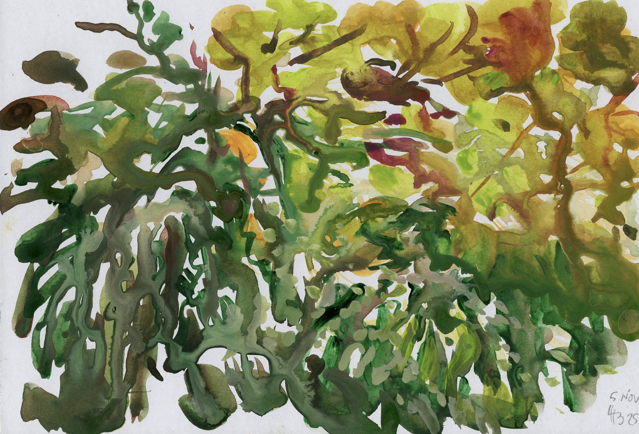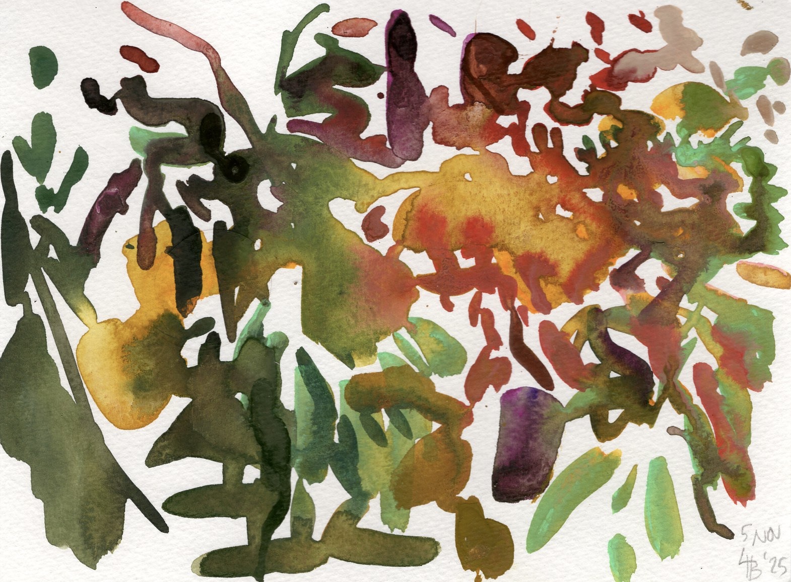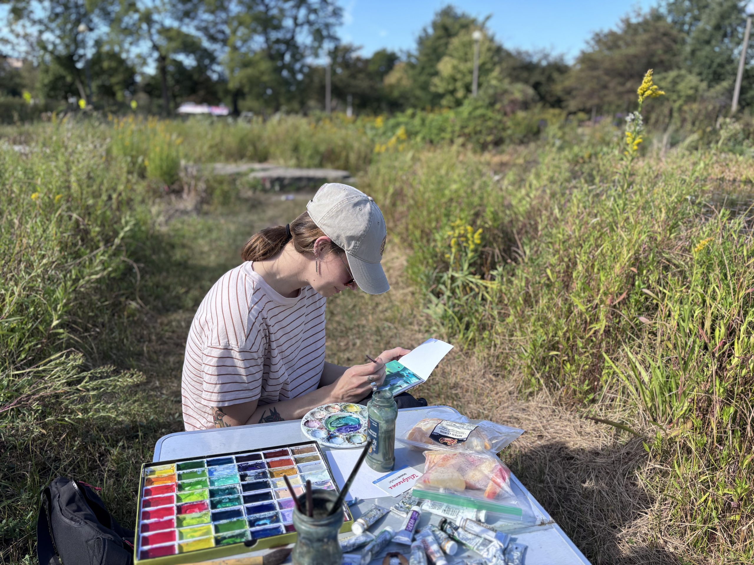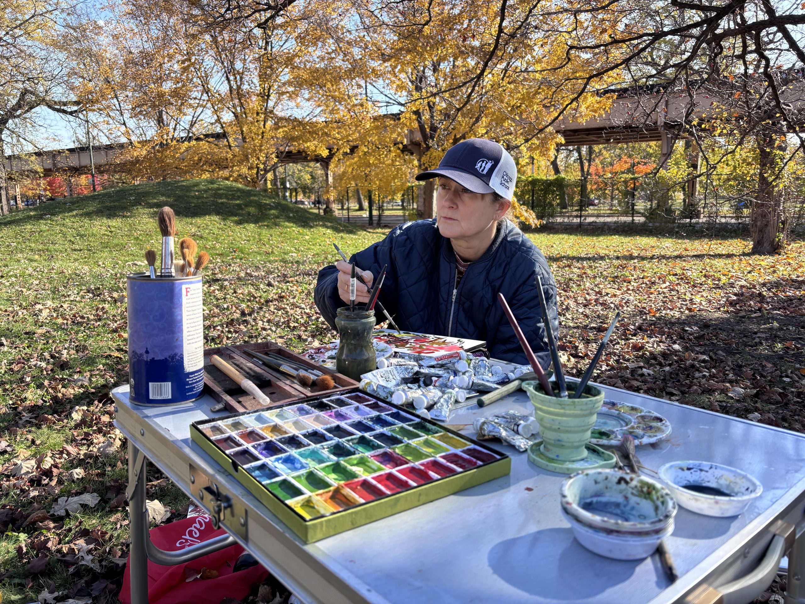What a lovely treat (sugar free, no less! đŸ˜‰ to get to paint outside with you on this crisp fall day. One of those days that makes Chicago feel like the best place to call home. It felt like a homecoming in so many ways, from traveling, but also coming home to a material and a practice I used to be so at home in. I recognize so much of myself in this picture, like literally, like someone I knew so long ago came back to visit. And of course in the bigger picture of a place and a practice, where sometimes it feels like it’s hard to connect with the present moment and situation, and then, out of the blue, connection is very easy and human. It was a very welcome and welcoming feeling to be brought into your practice and project like that. Thank you for that and for the great and meandering conversation we had, about places, spaces, our bodies and our trying to feel at home and at ease in it all as we age and progress, regress and digress.
