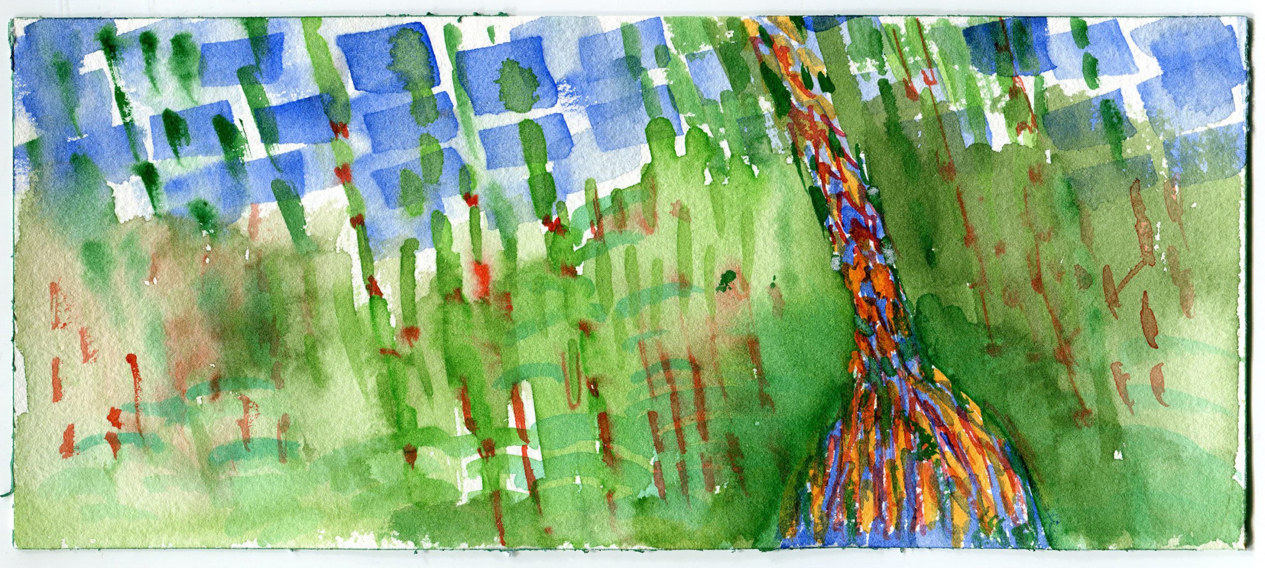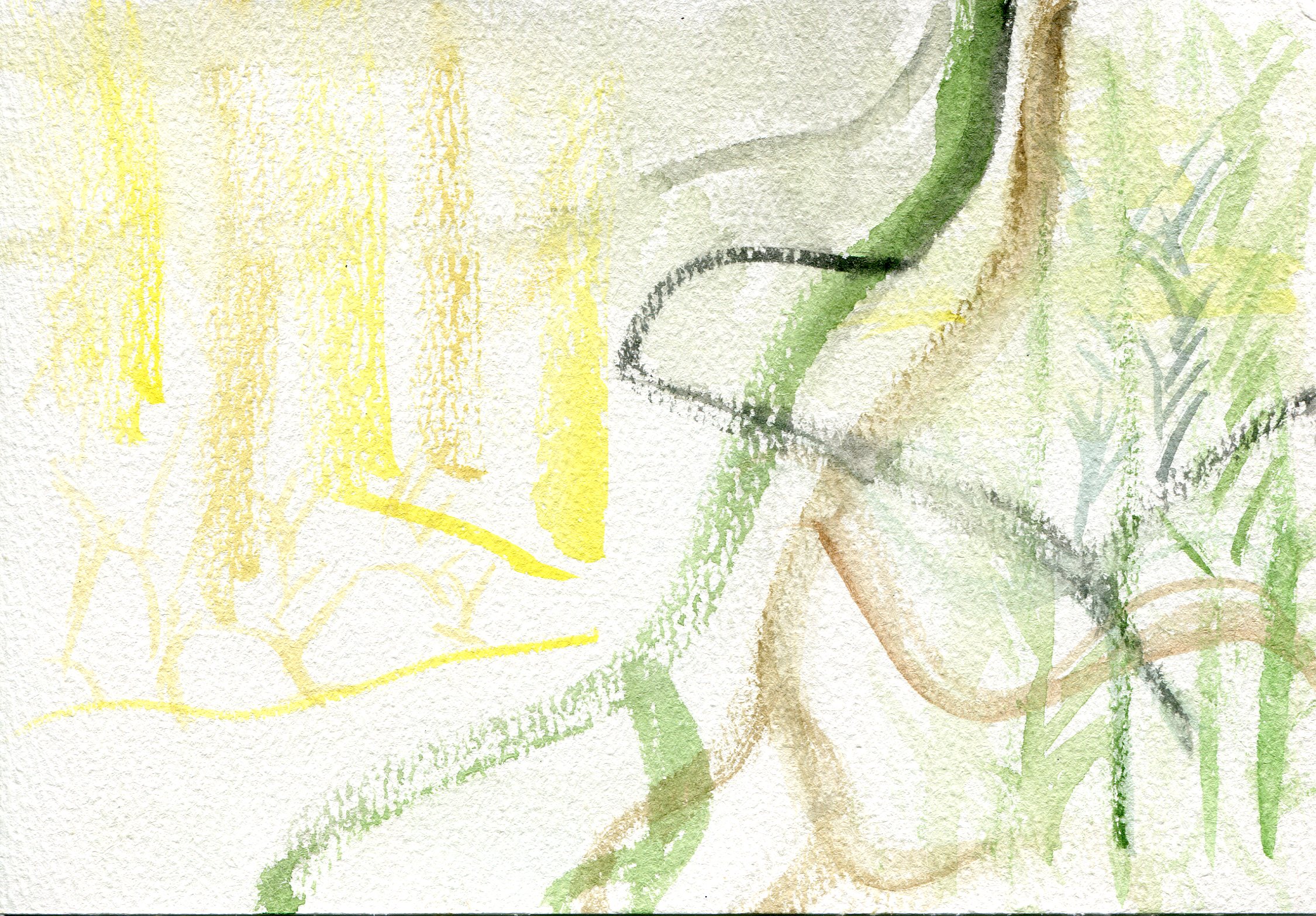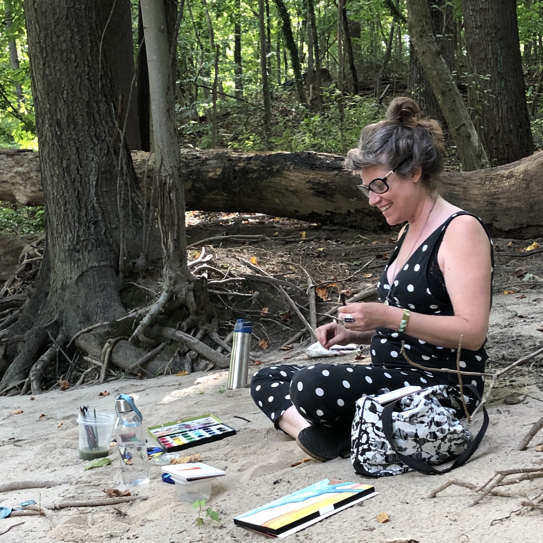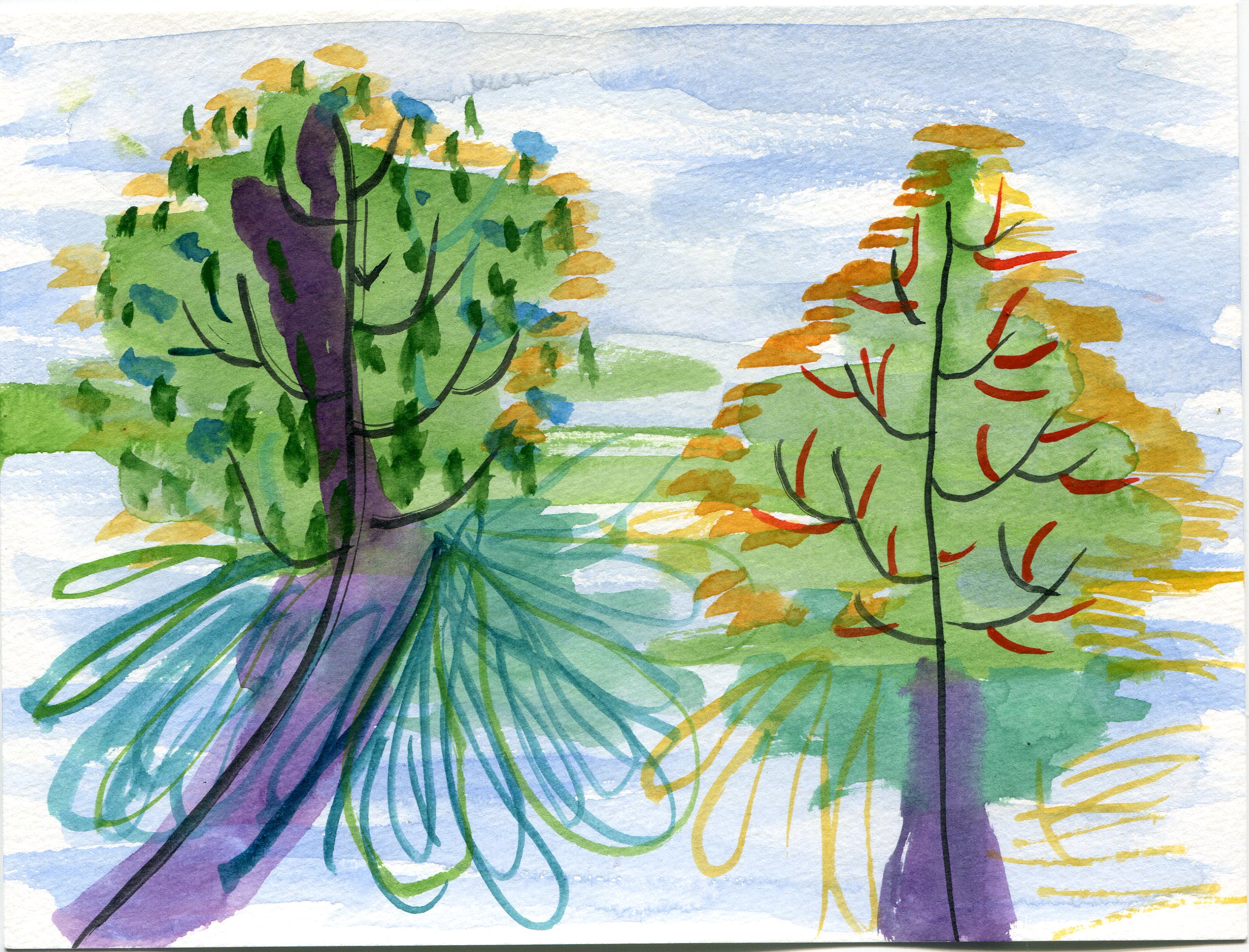 Watercolor painting outside with Leslie was like dying wood pulp, while walking backwards through light and time in the forest….Janet. A chance to slow down and look. To connect the eye with my hand. To observe color in natural light and translate through the brush.