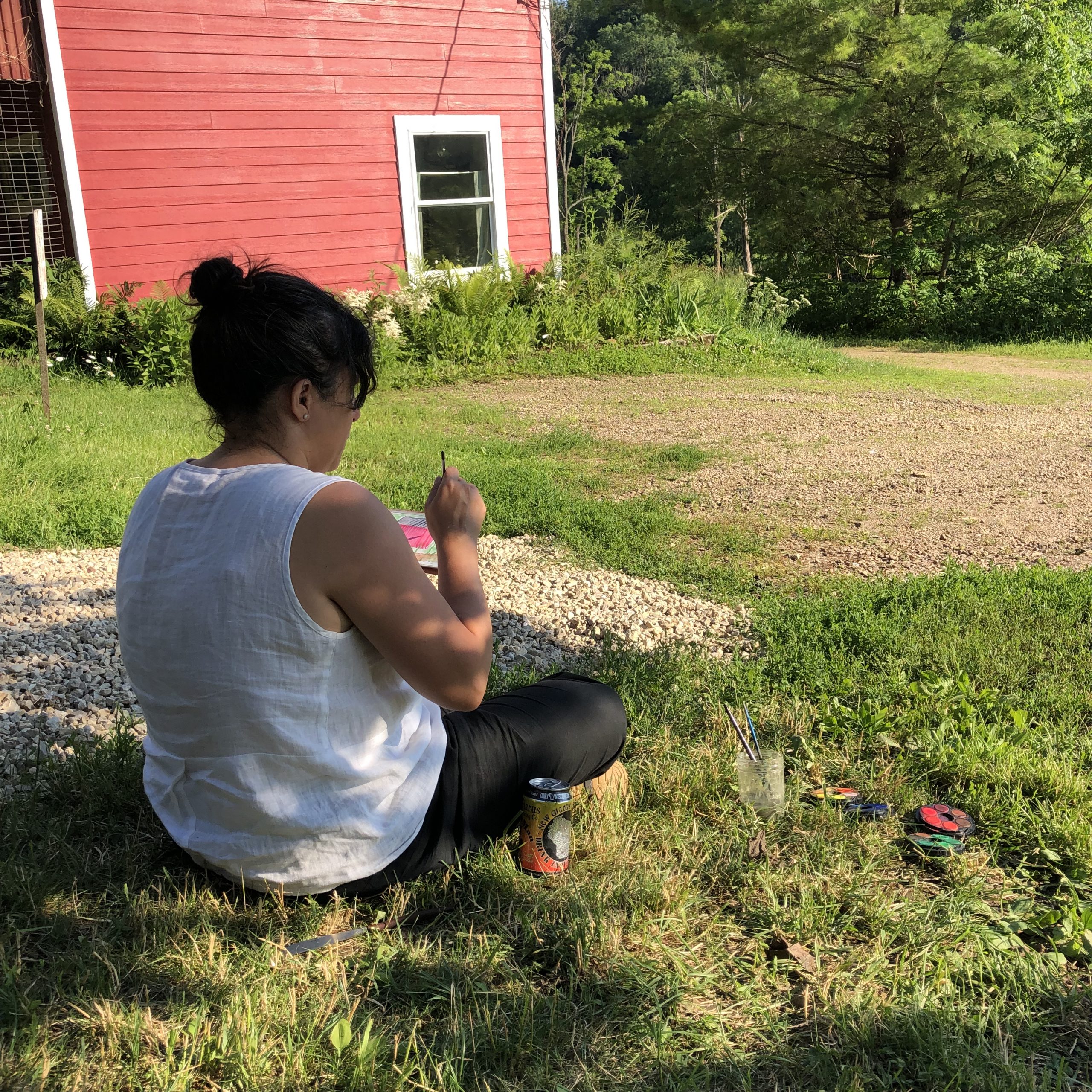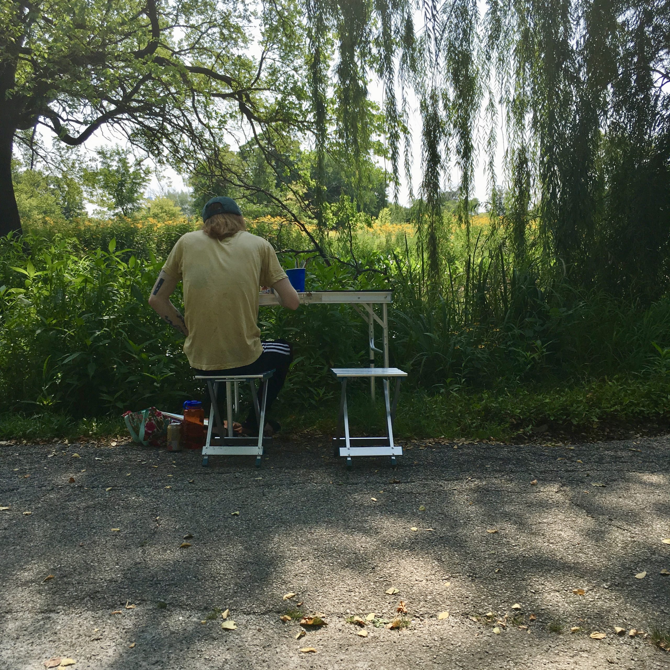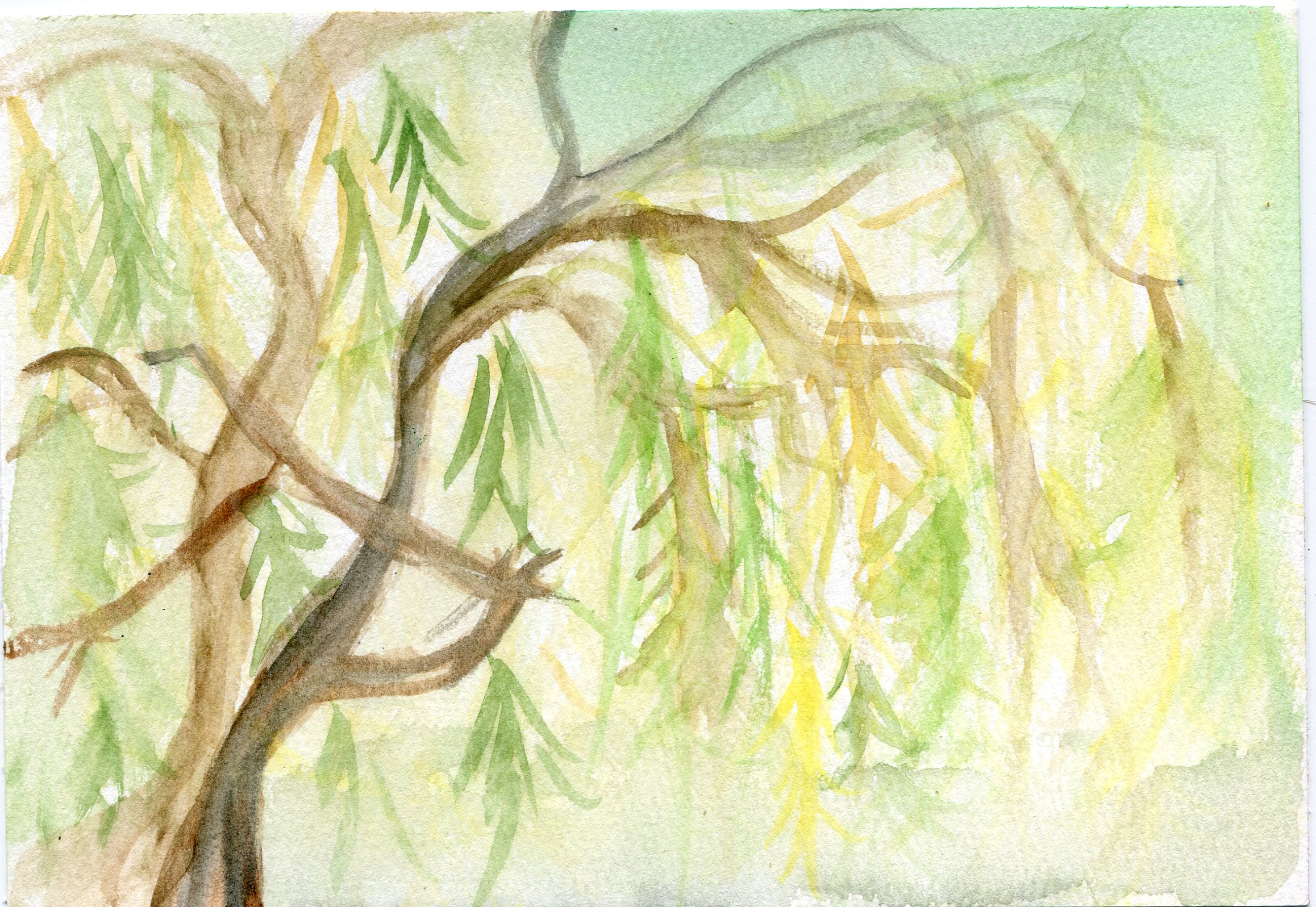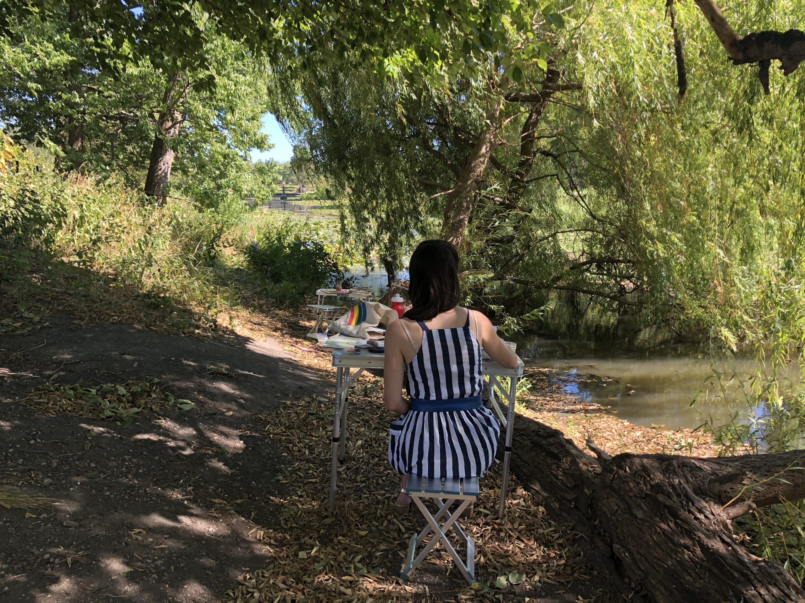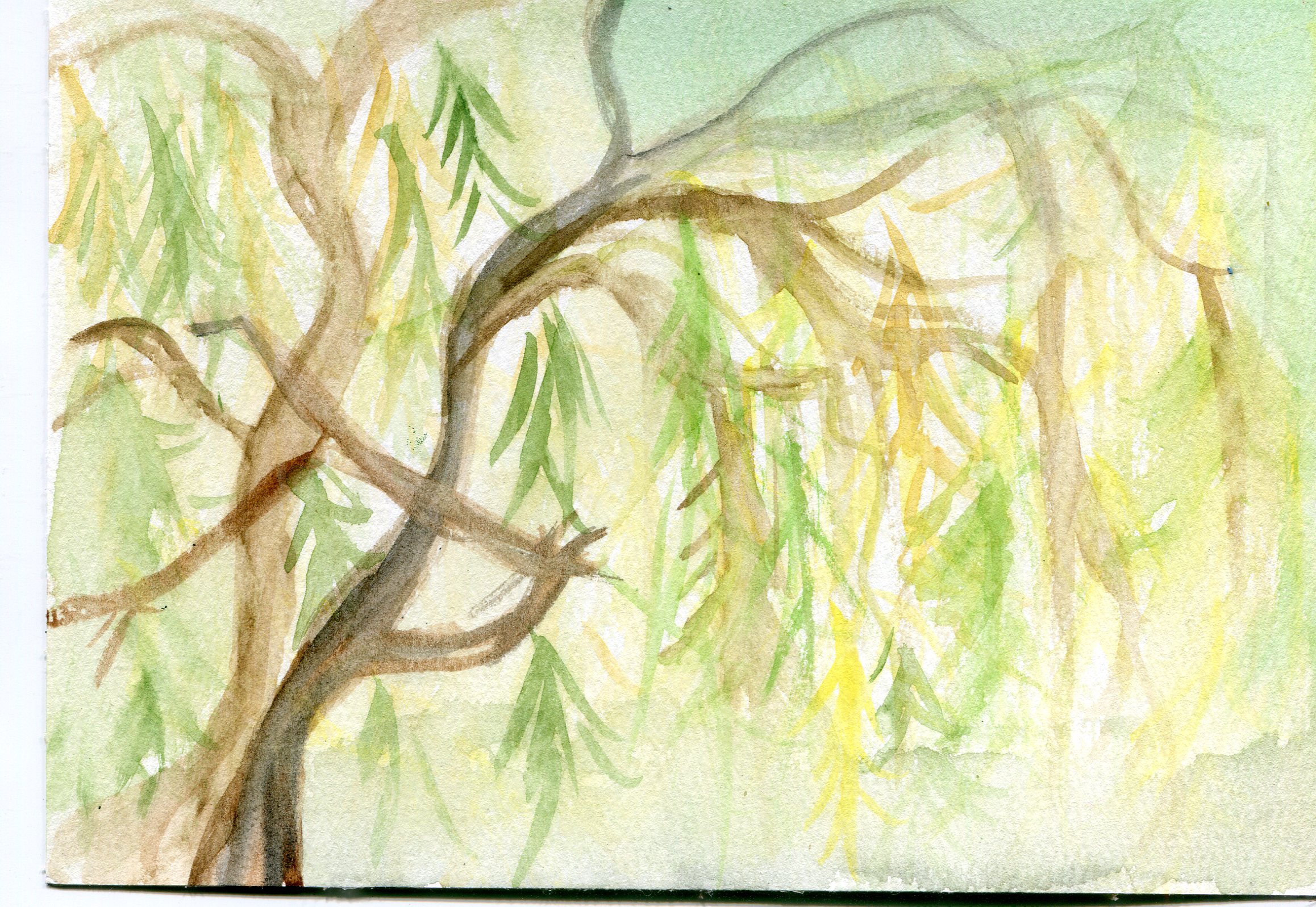 A day where the sun was hot but the shade was cool. I remember sound of the willow trees dancing in the wind. A curious snake ran across our feet, twice! Our brushes were busy making suns, flowers, and bits of sky.