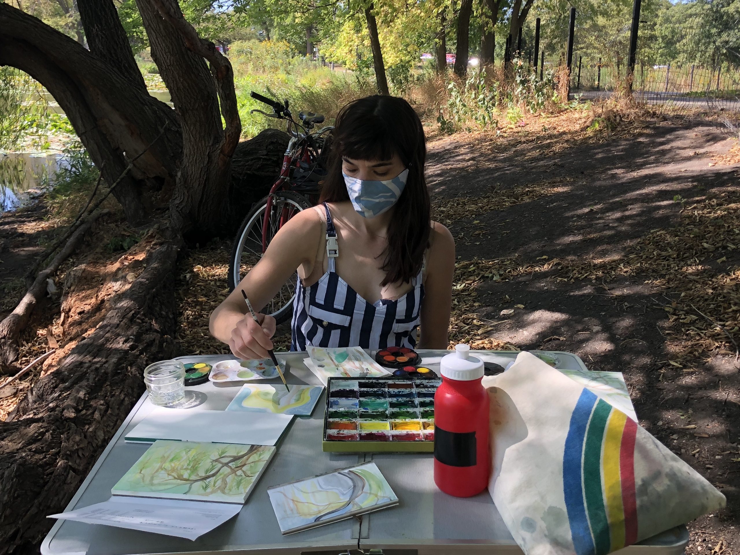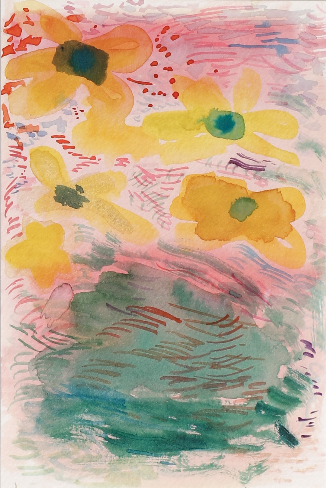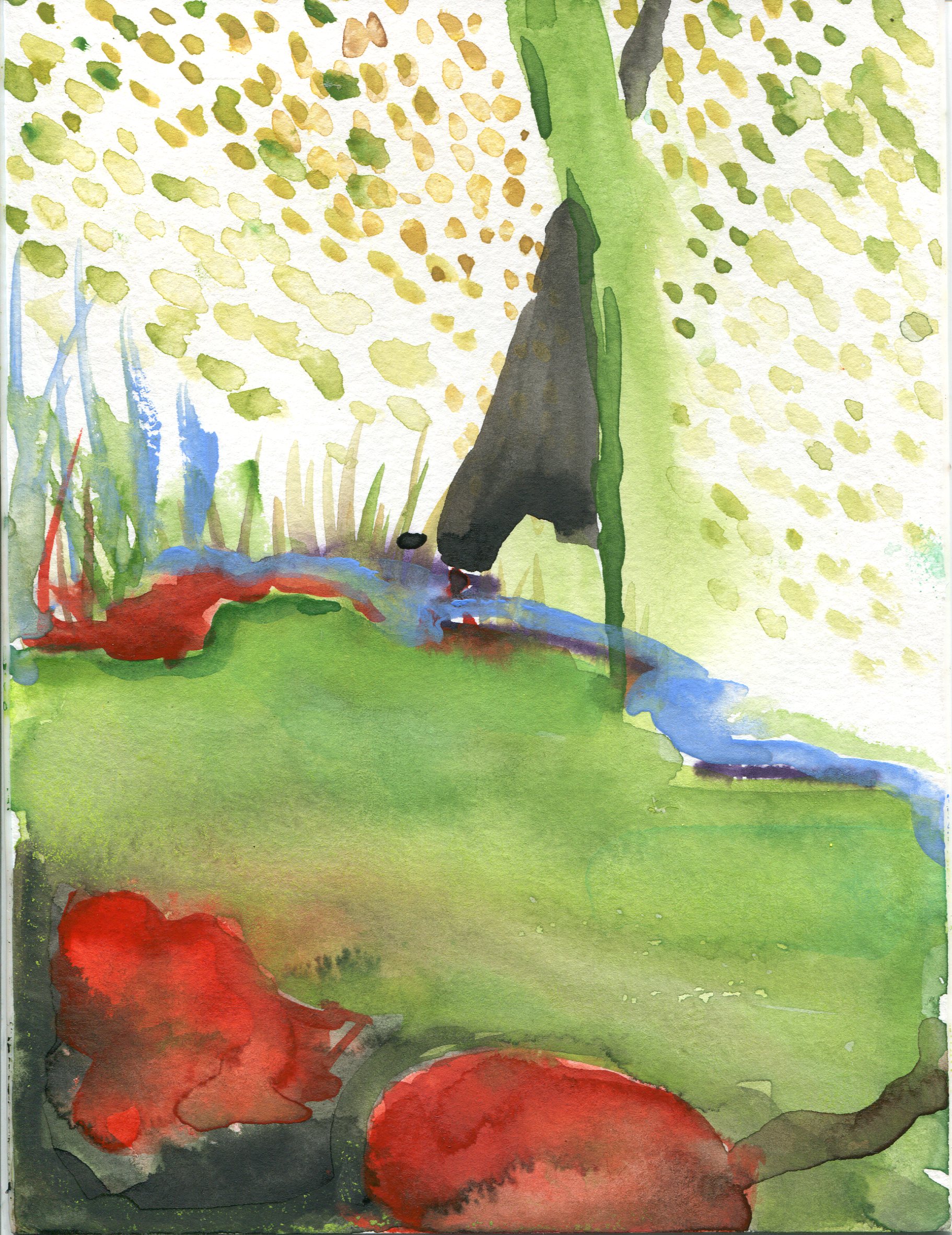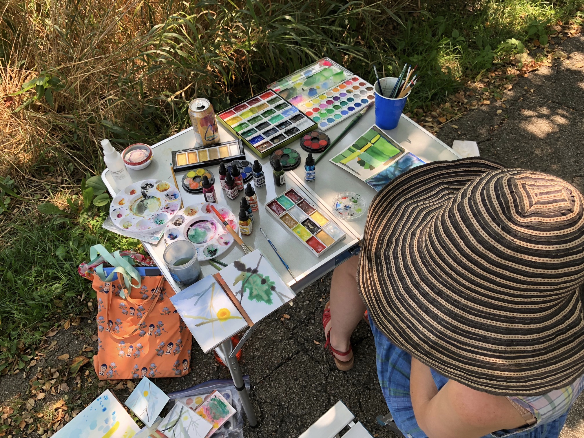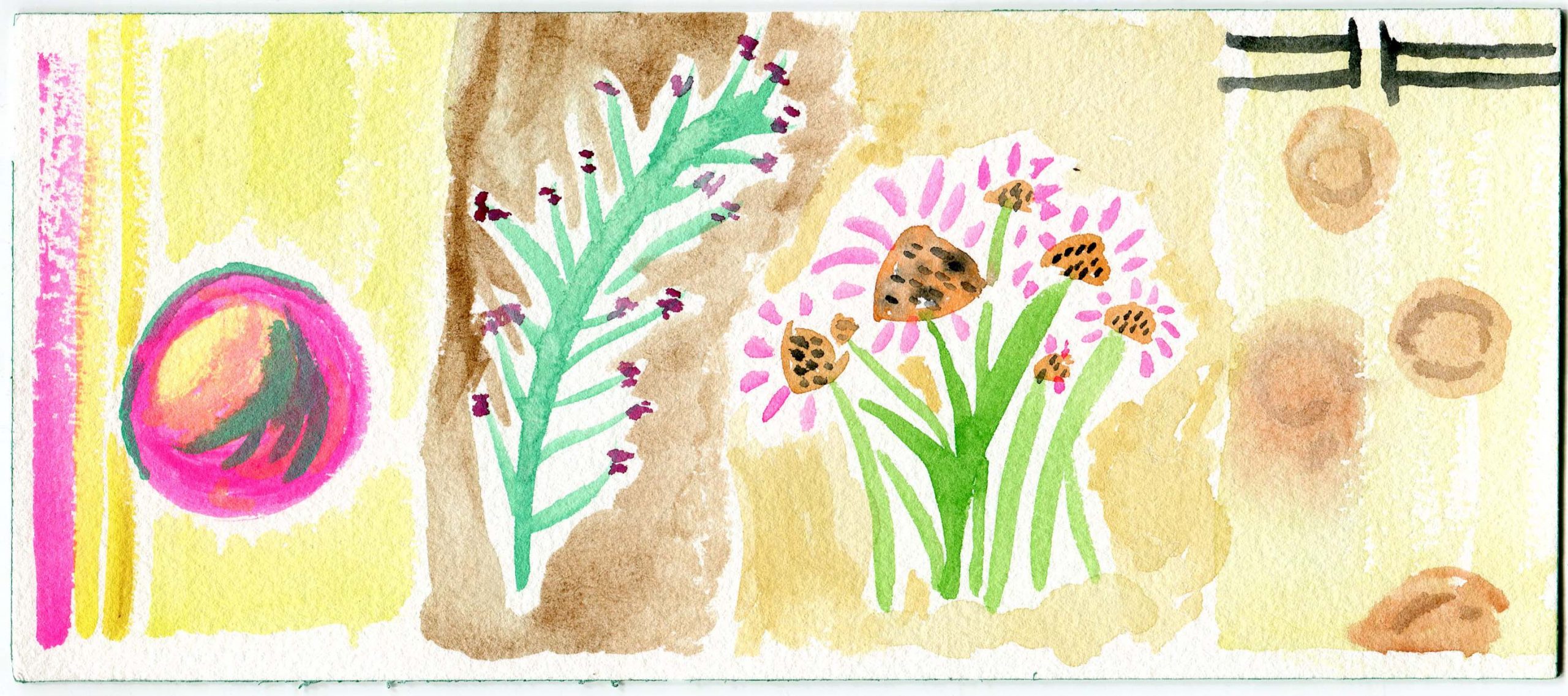 A day where the sun was hot but the shade was cool. I remember sound of the willow trees dancing in the wind. A curious snake ran across our feet, twice! Our brushes were busy making suns, flowers, and bits of sky.