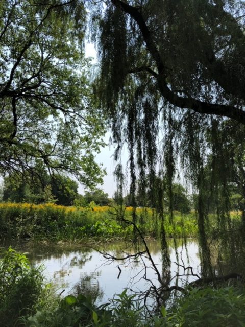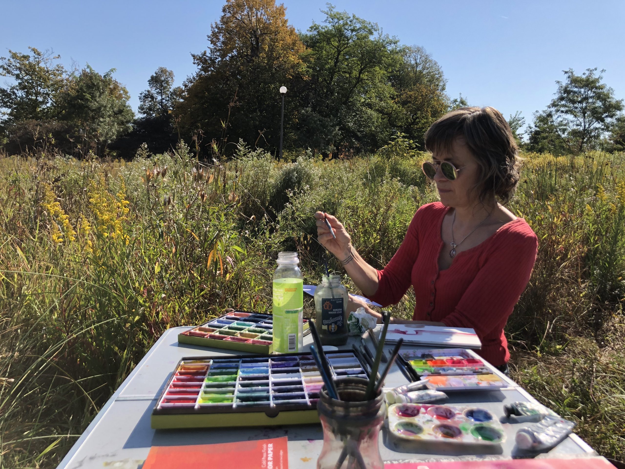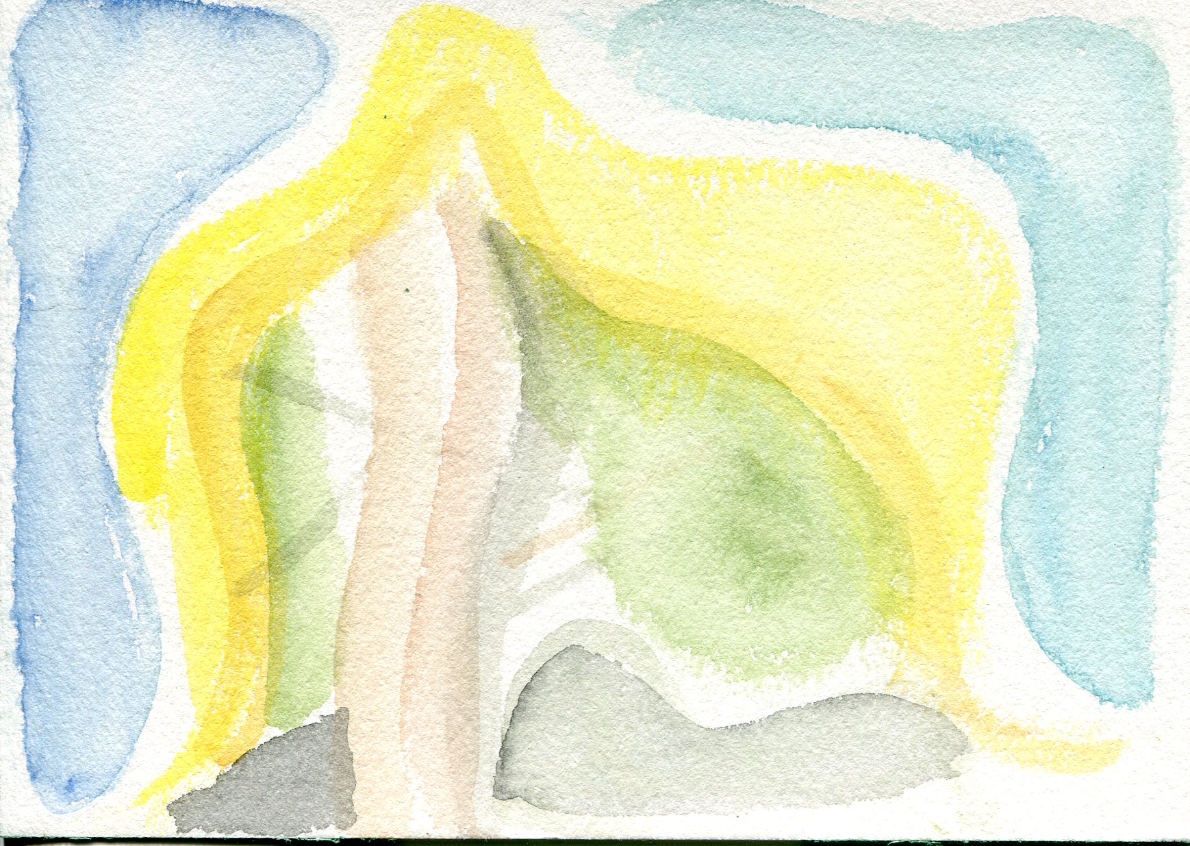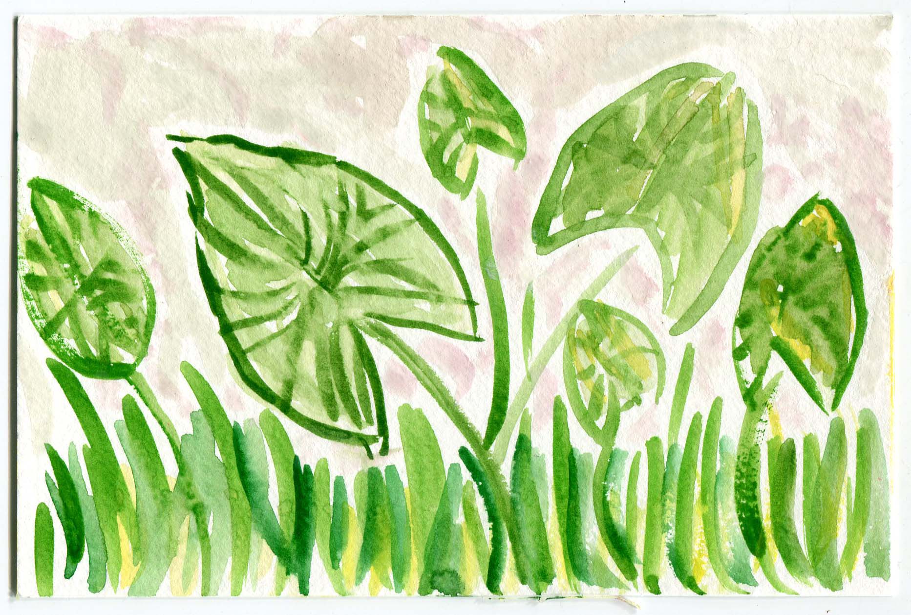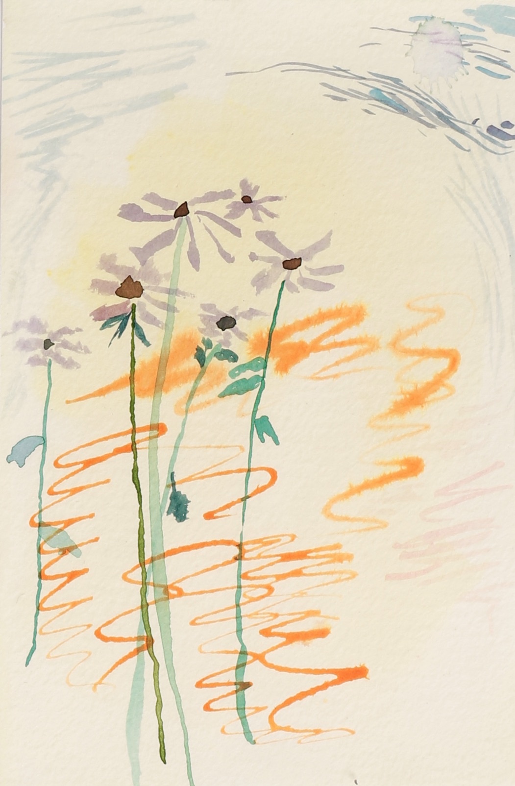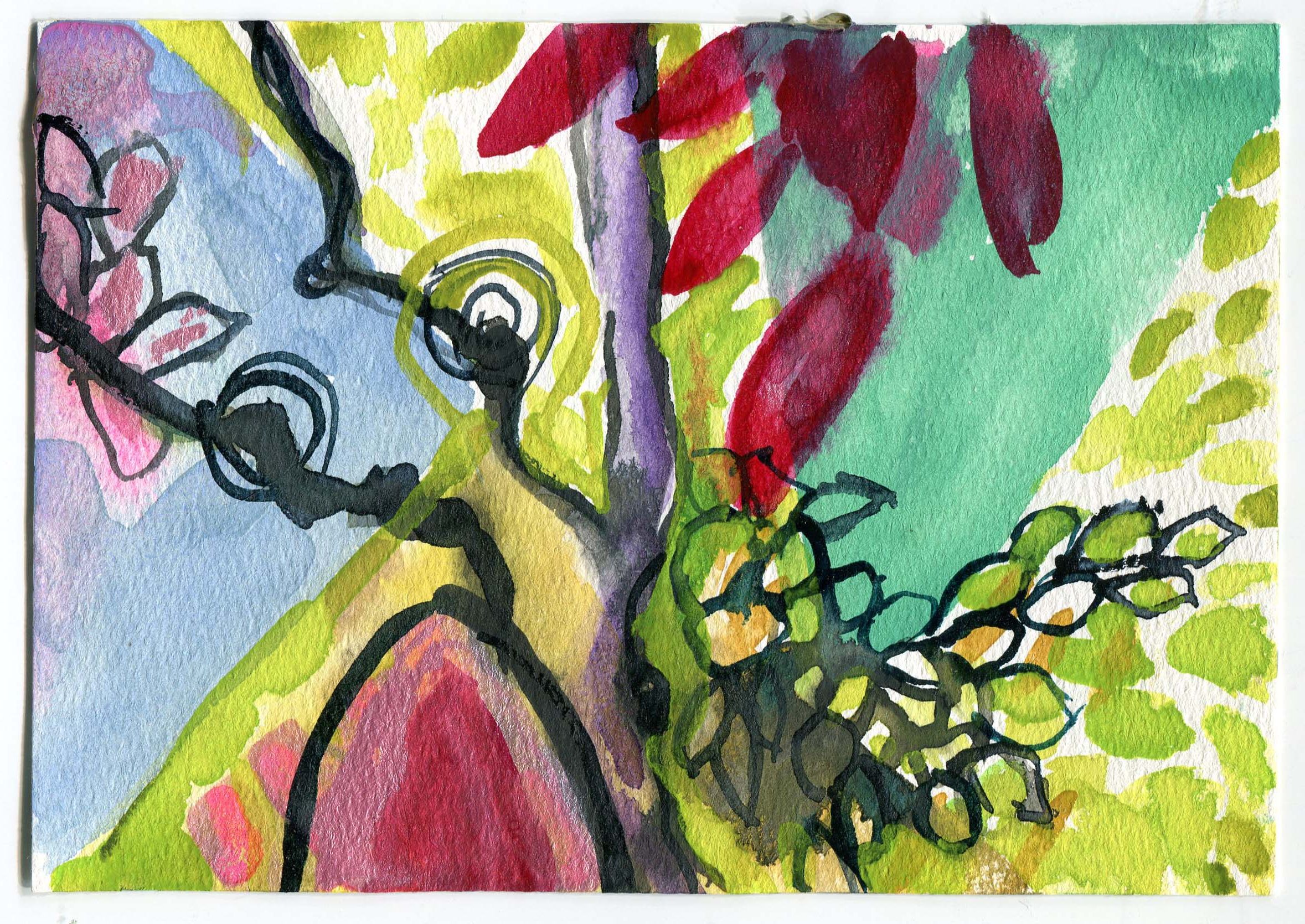 A day where the sun was hot but the shade was cool. I remember sound of the willow trees dancing in the wind. A curious snake ran across our feet, twice! Our brushes were busy making suns, flowers, and bits of sky.
