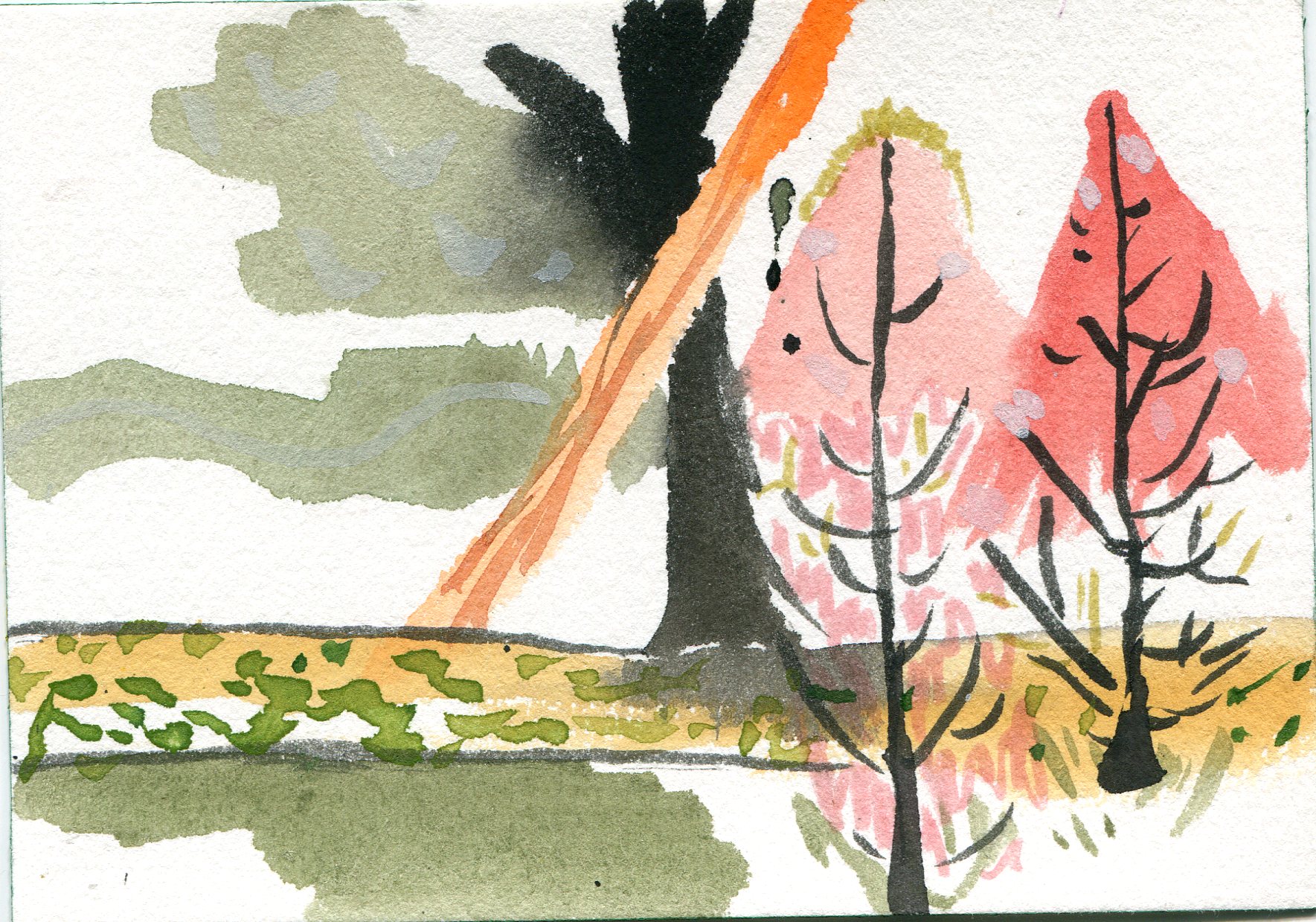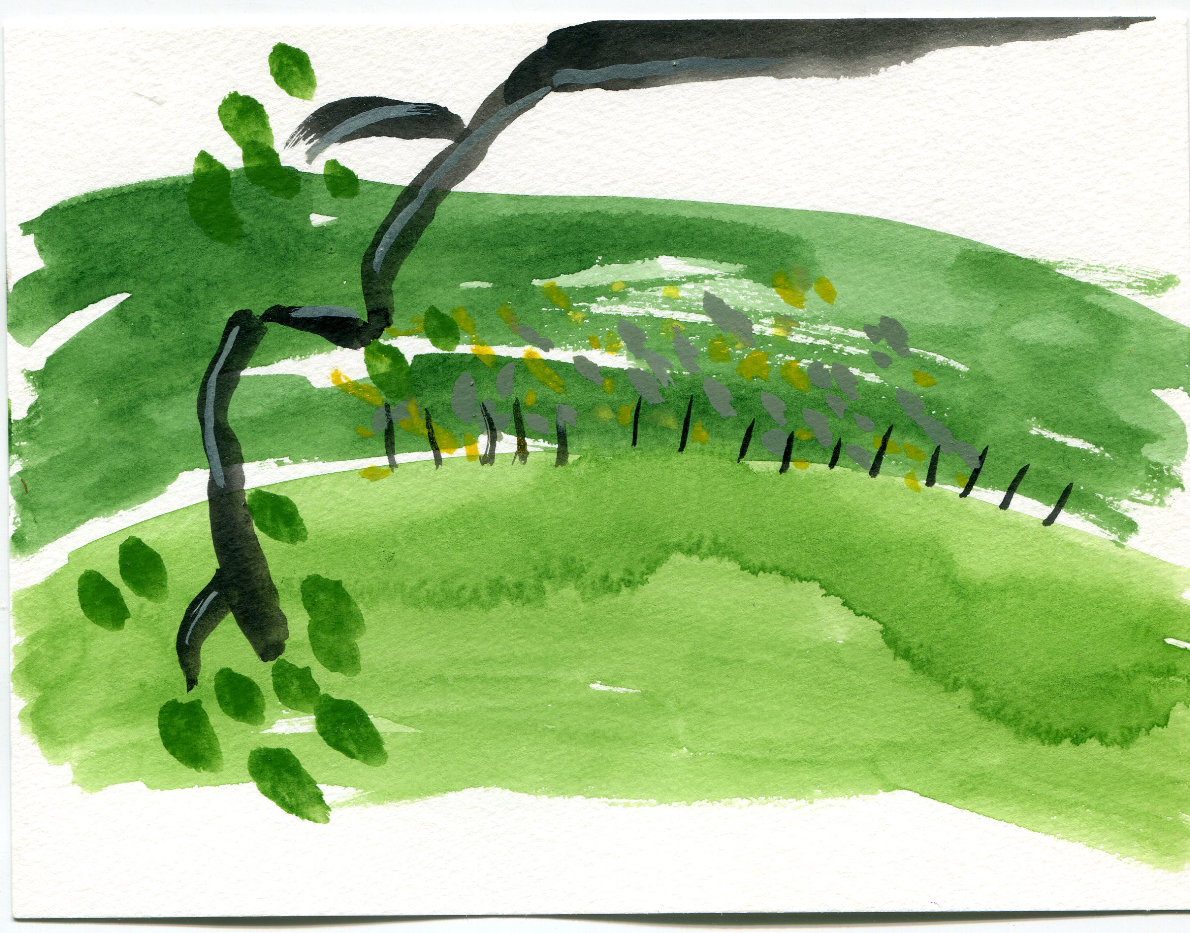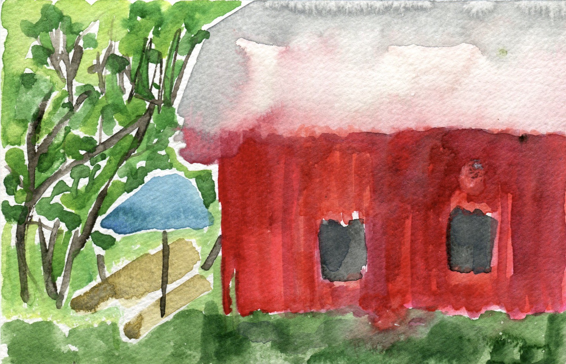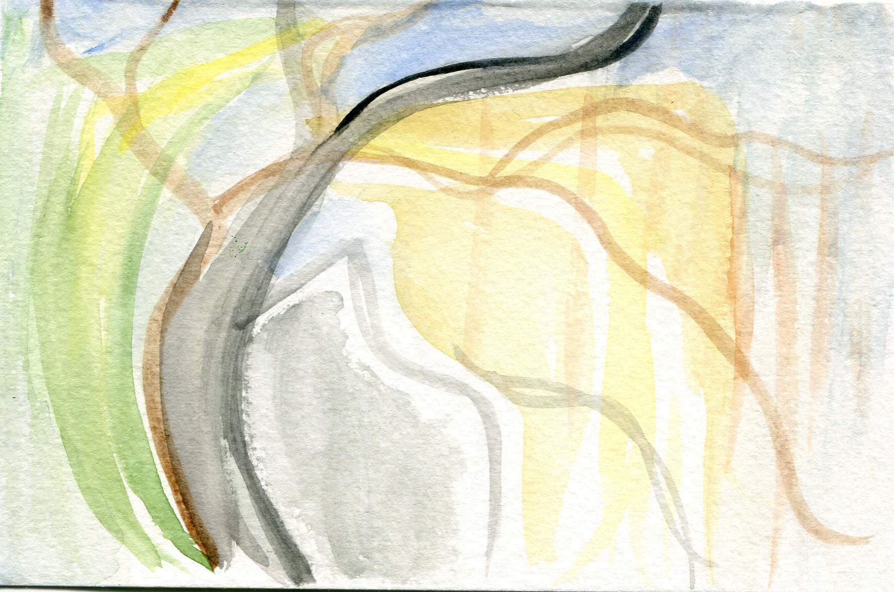 We cleared dirt off the picnic tables and repositioned them so we could work side by side. We sat down, chatted about watercolor materials, and then got to work and shared intimate and quiet thoughts continuously. Leslie built up two or three brilliantly, colored watercolors. I lost track of the brilliant colors and found an image of grays.