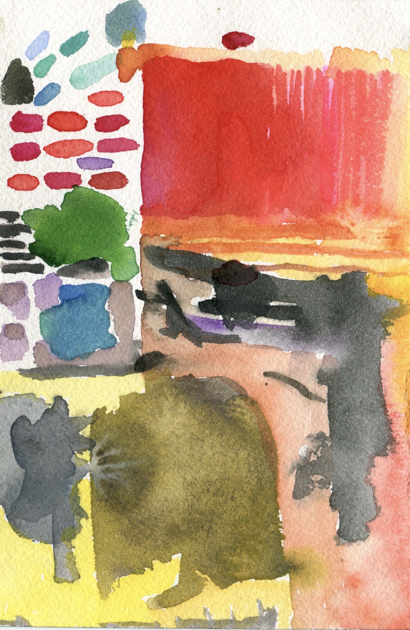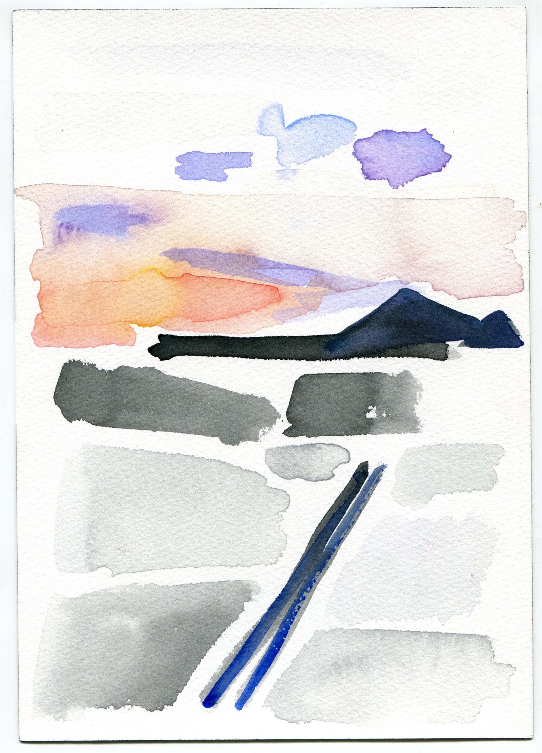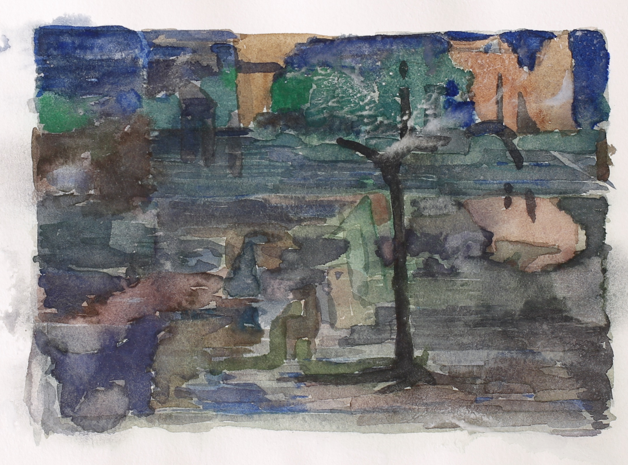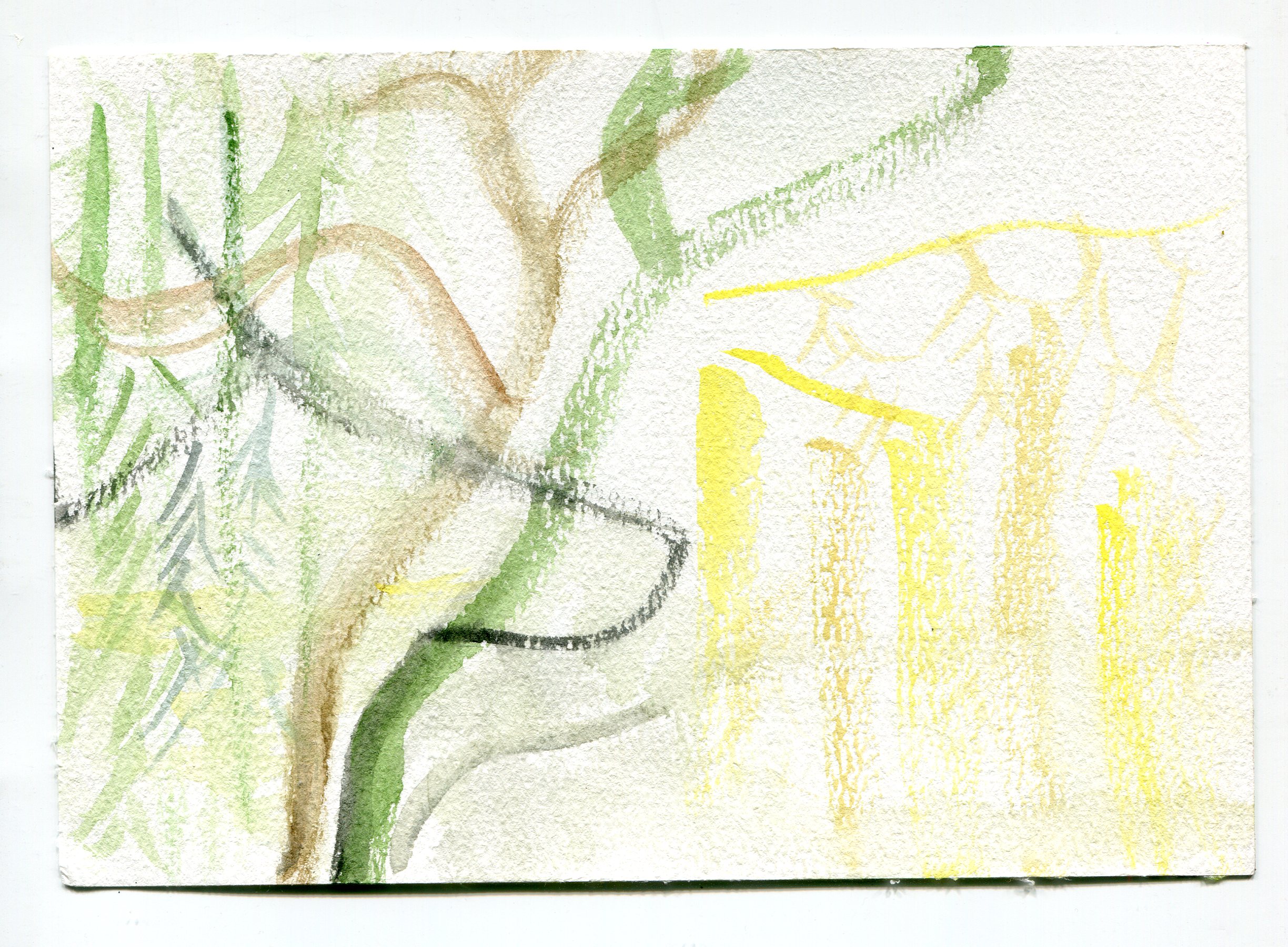 We cleared dirt off the picnic tables and repositioned them so we could work side by side. We sat down, chatted about watercolor materials, and then got to work and shared intimate and quiet thoughts continuously. Leslie built up two or three brilliantly, colored watercolors. I lost track of the brilliant colors and found an image of grays.