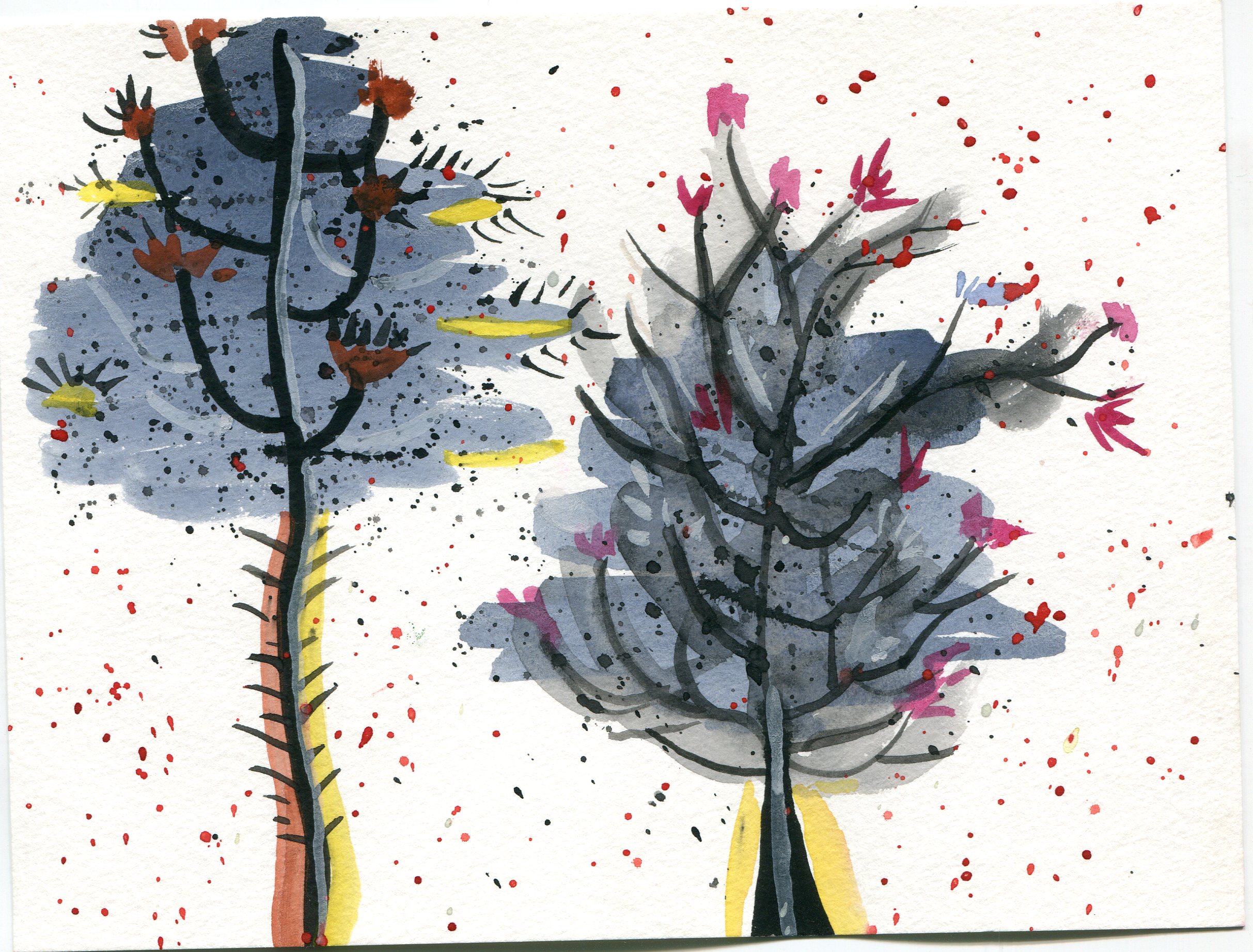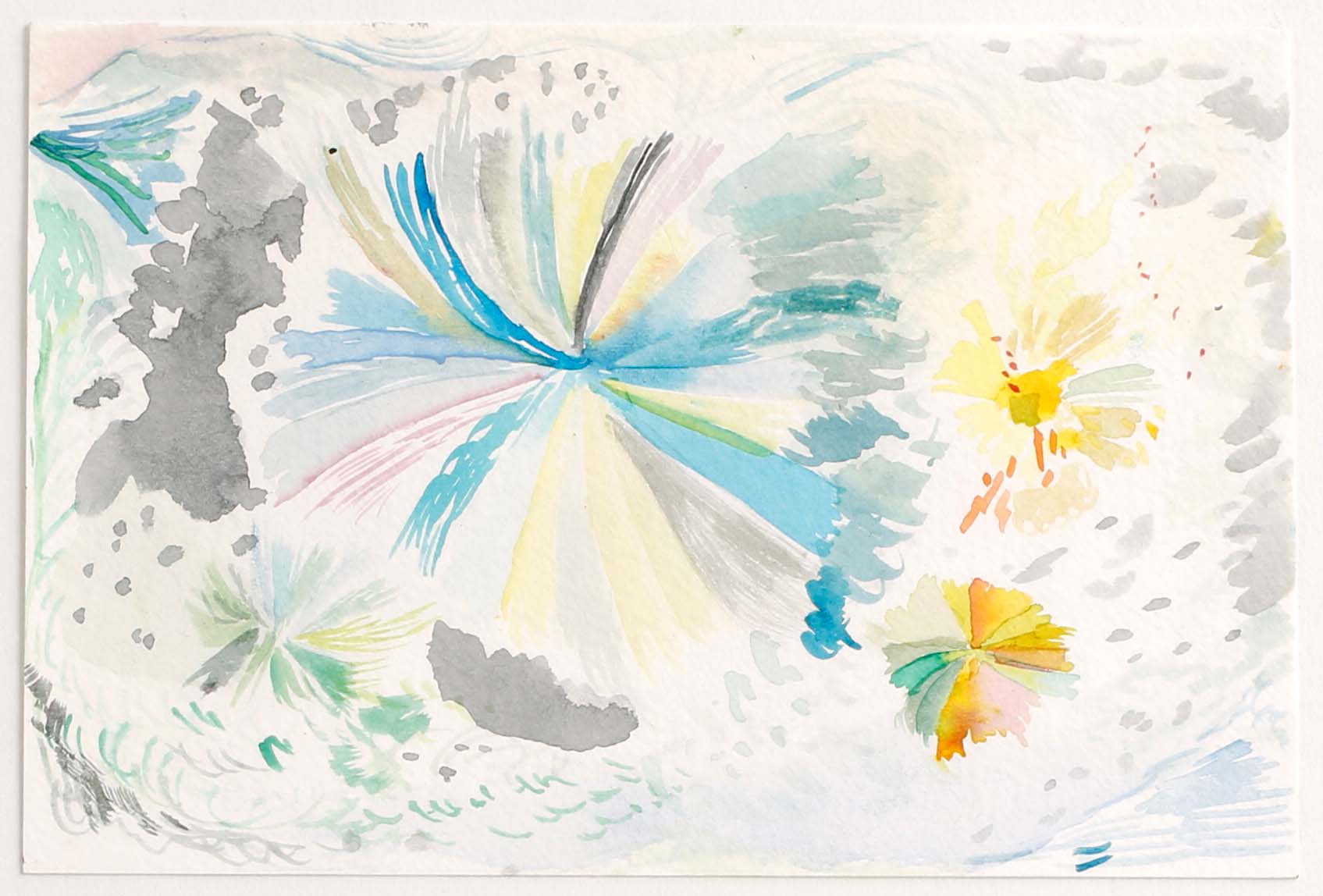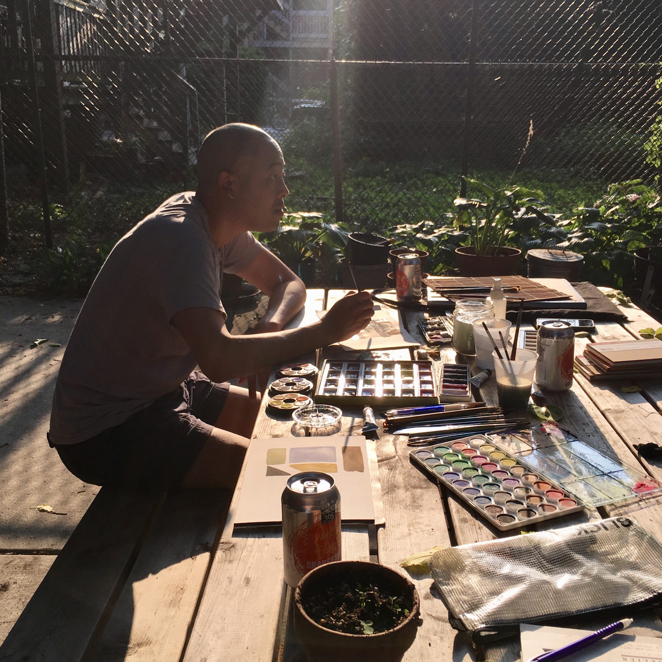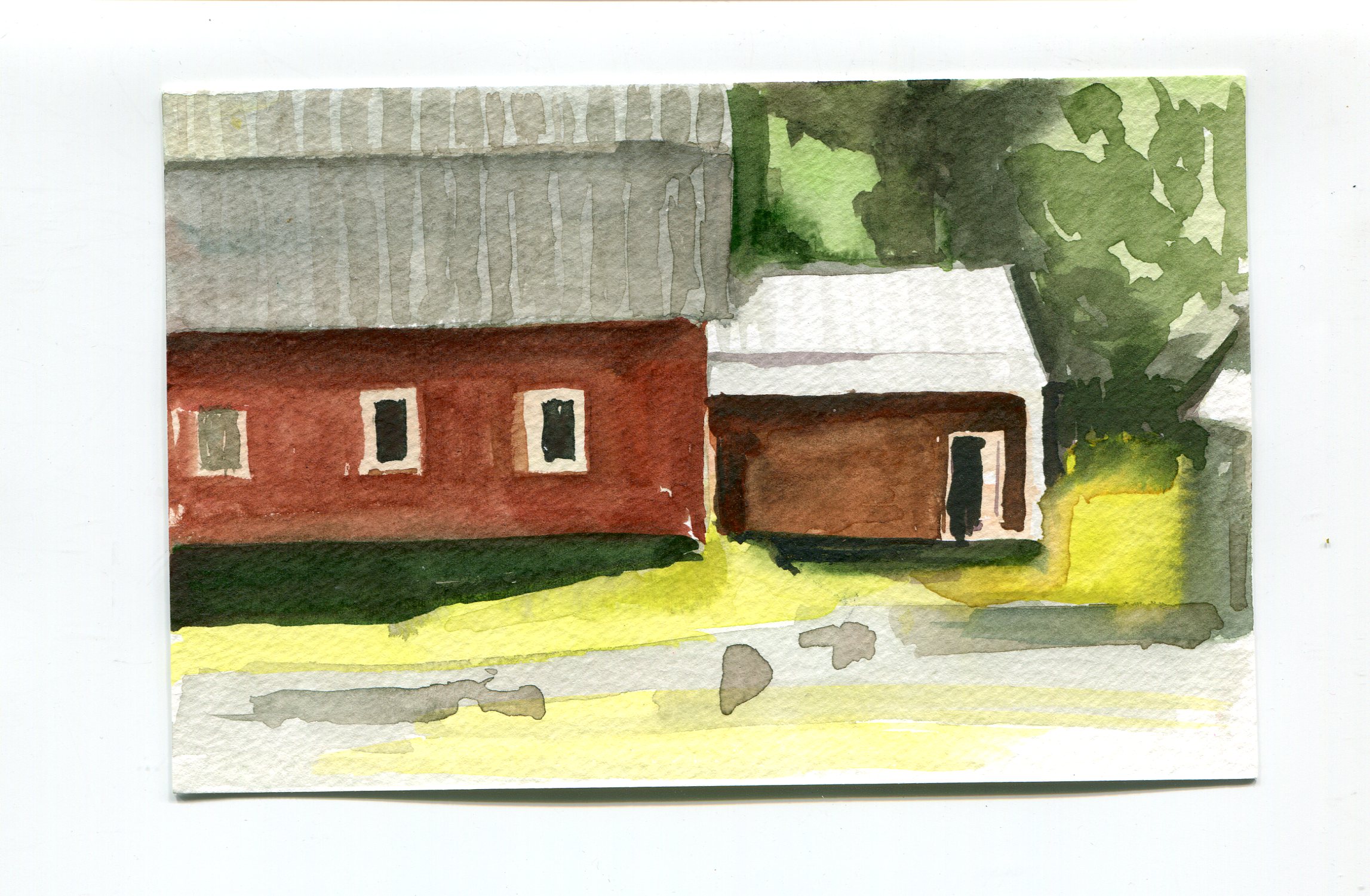 We cleared dirt off the picnic tables and repositioned them so we could work side by side. We sat down, chatted about watercolor materials, and then got to work and shared intimate and quiet thoughts continuously. Leslie built up two or three brilliantly, colored watercolors. I lost track of the brilliant colors and found an image of grays.