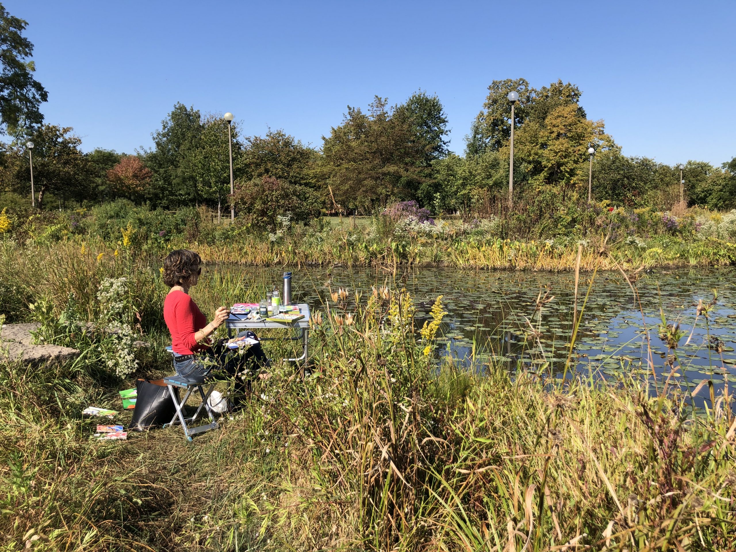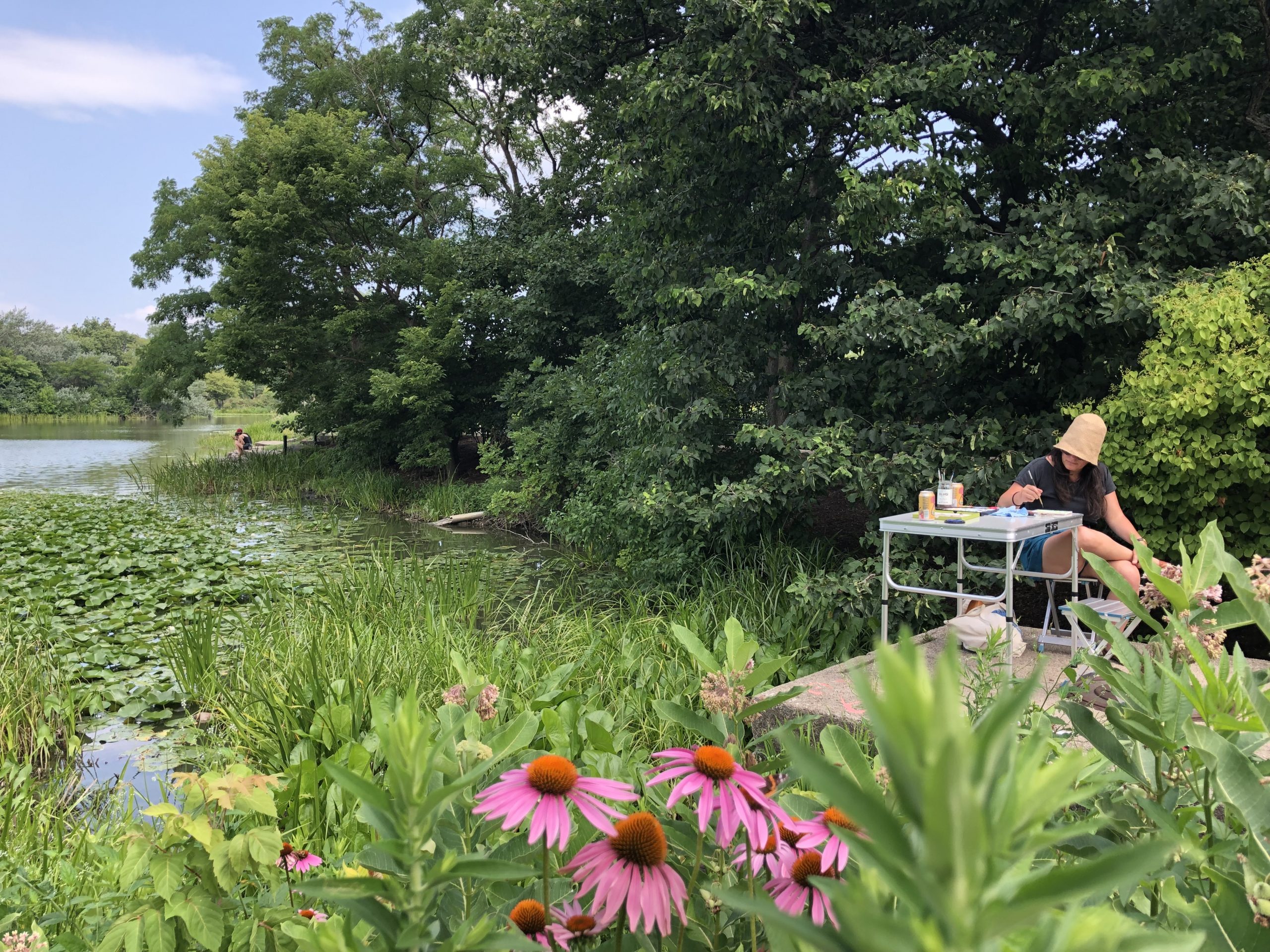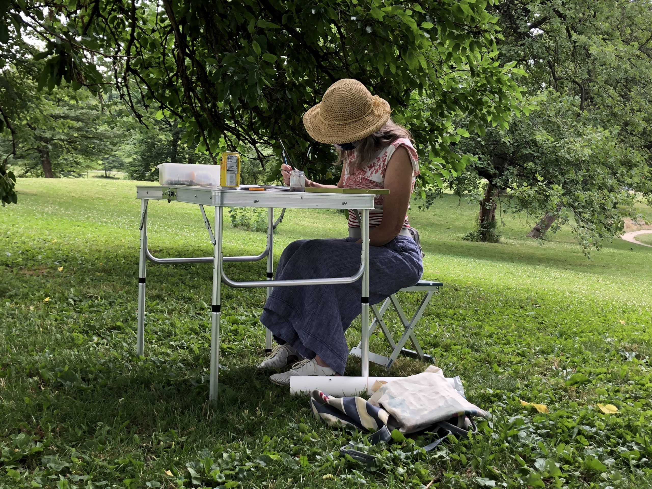 These were not only those formed of moving water, lines, shapes, wind, heat and leaves, but also the communing around which this plein air painting project is structured. My peripheral senses are often stronger than my direct line of sight. And so this setting – a plein air painting date in Baltimore, Maryland, was for me much more about the subject of being, listening and looking together as artists, friends, cousins. It was an opportunity to weave connection into reflections of color, shape, form.